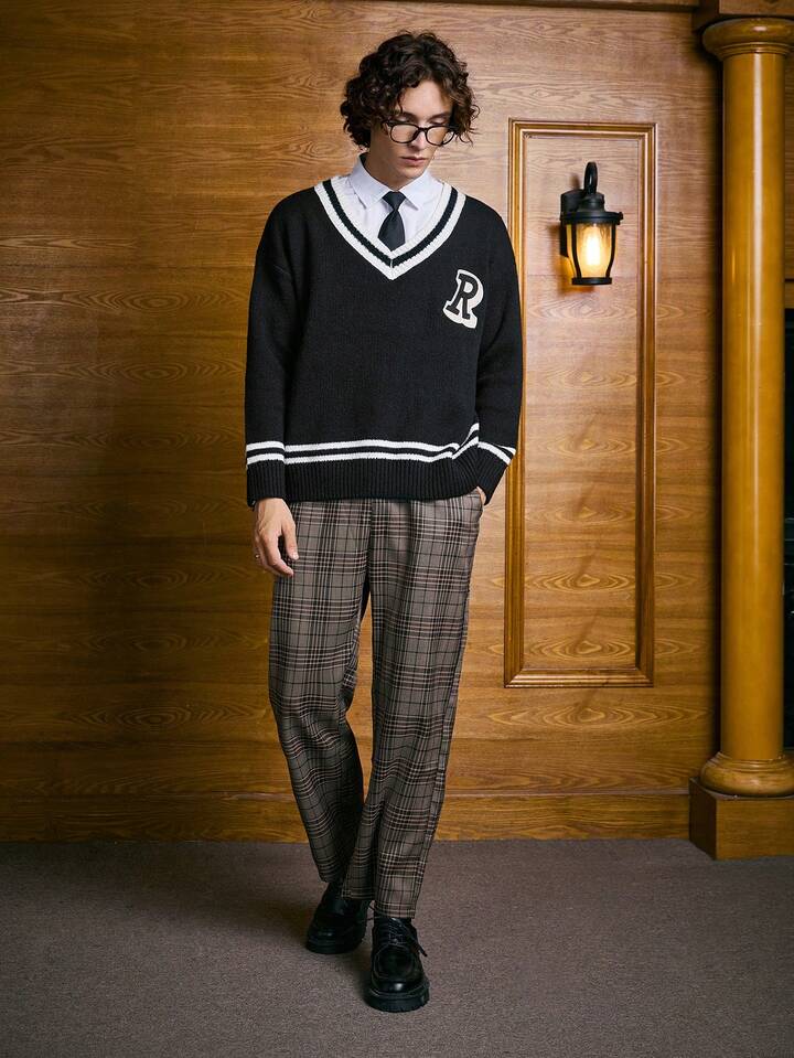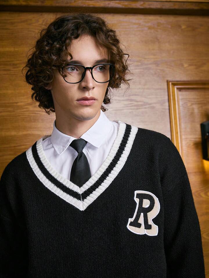 Academia Hombres Jersey cricket con patrón de letra ribete de rayas sin camisa