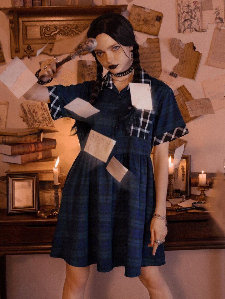 Academia Vestido Escocés Con Botones Delanteros Y Bolsillos