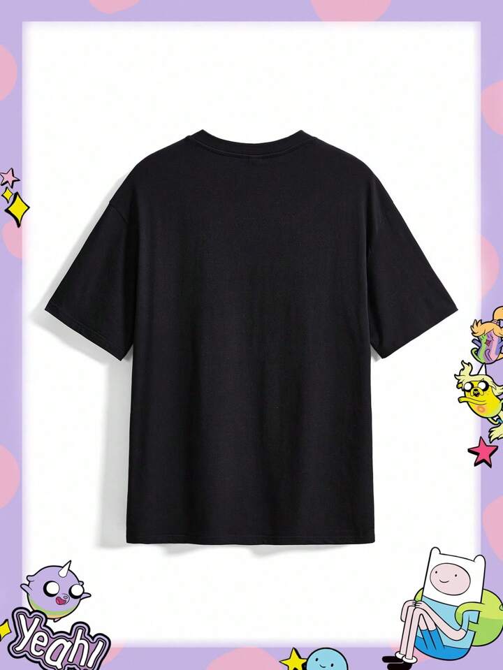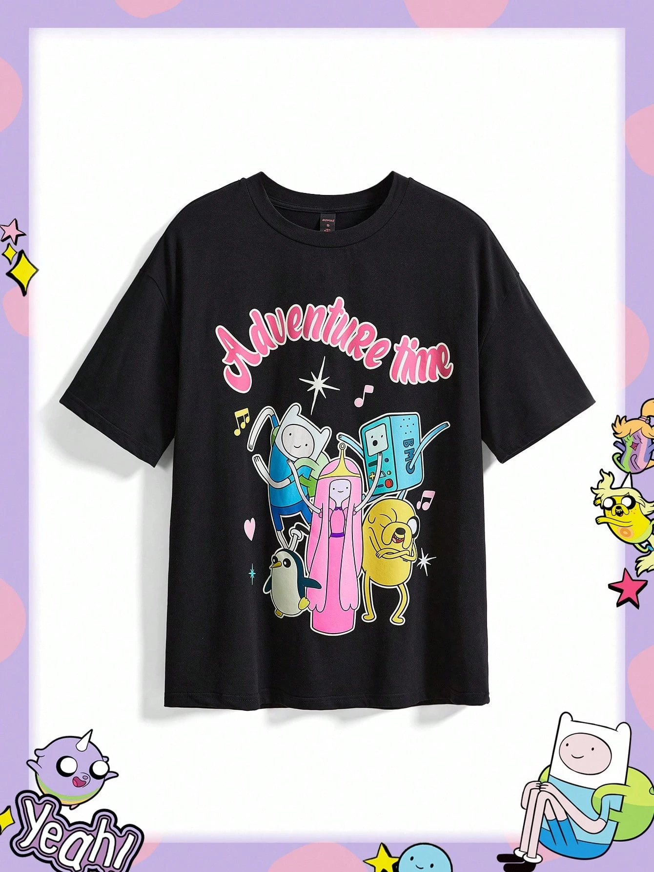 Adventure Time X ROMWE Camiseta holgada de mujer con estampado de dibujos animados negros y eslogan
