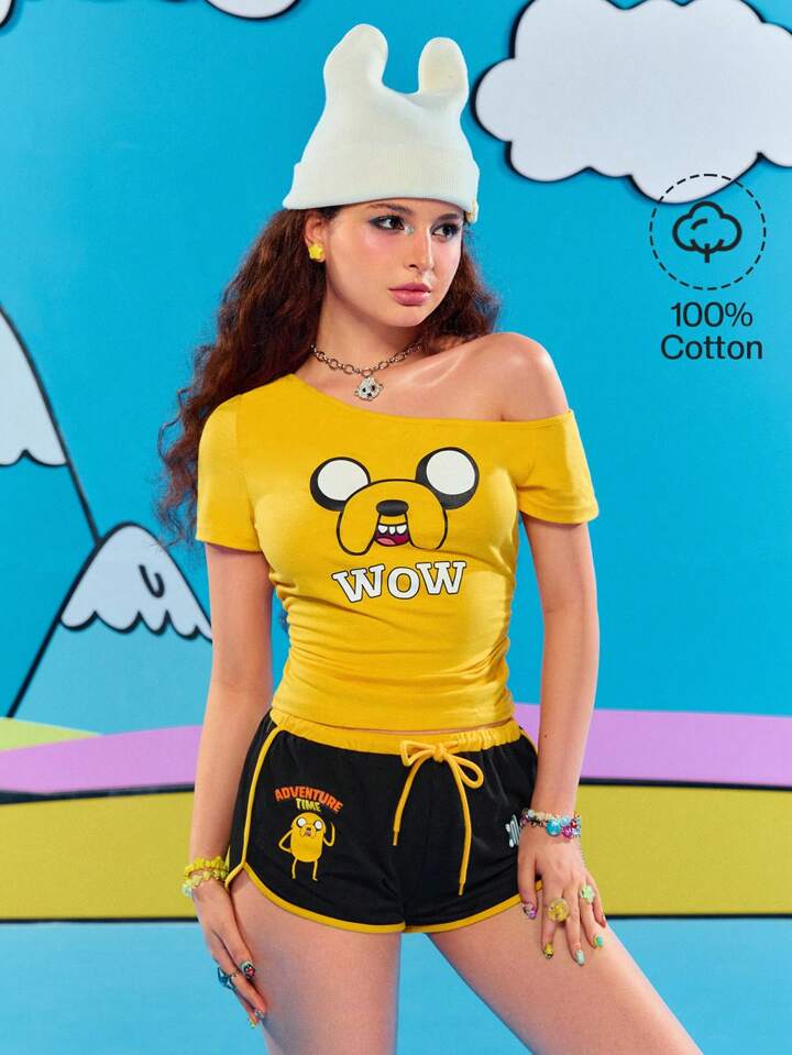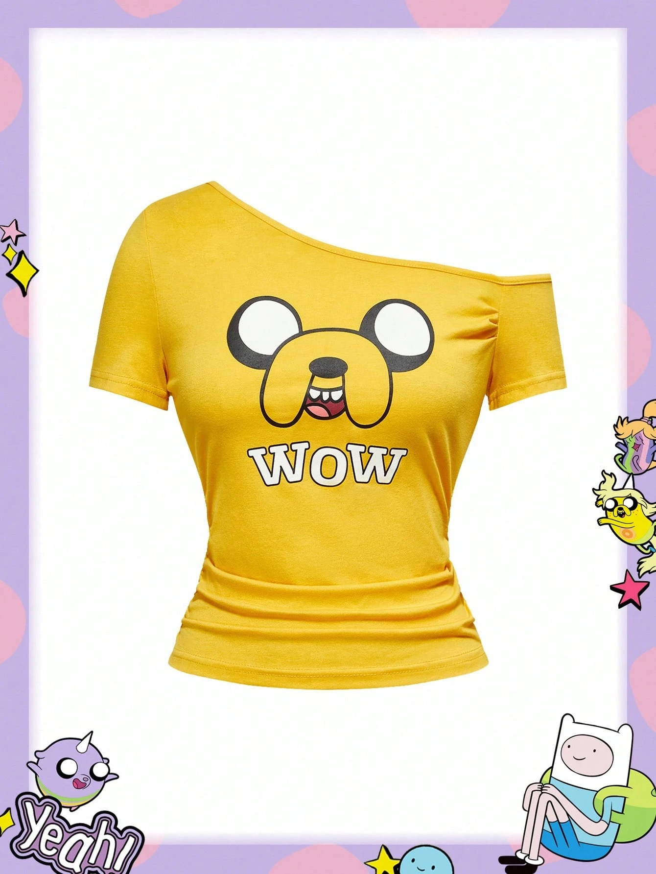 Adventure Time X ROMWE Camiseta de mujer ajustada con manga corta, hombro asimétrico y drapeado
