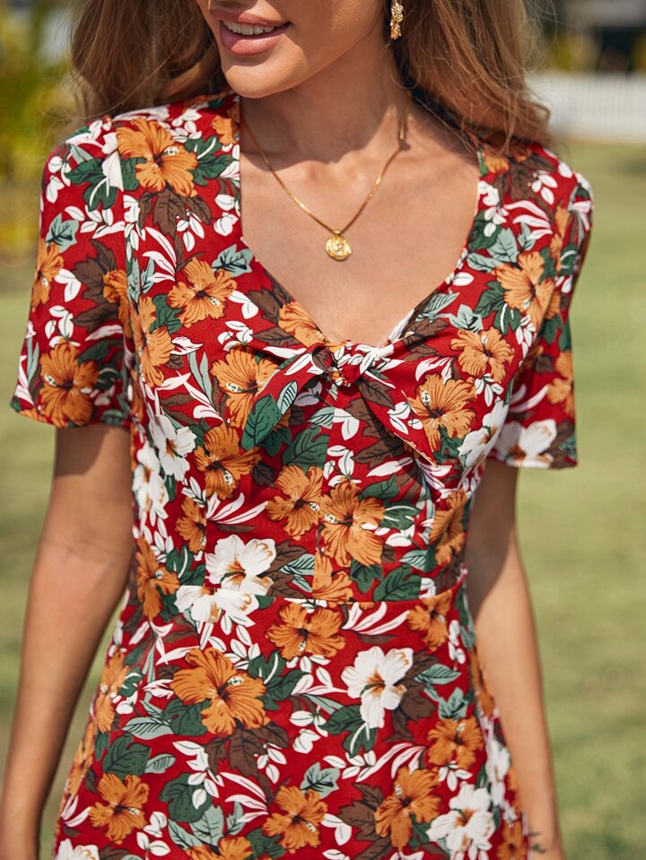 Vestido con ojal trasero con nudo delantero floral