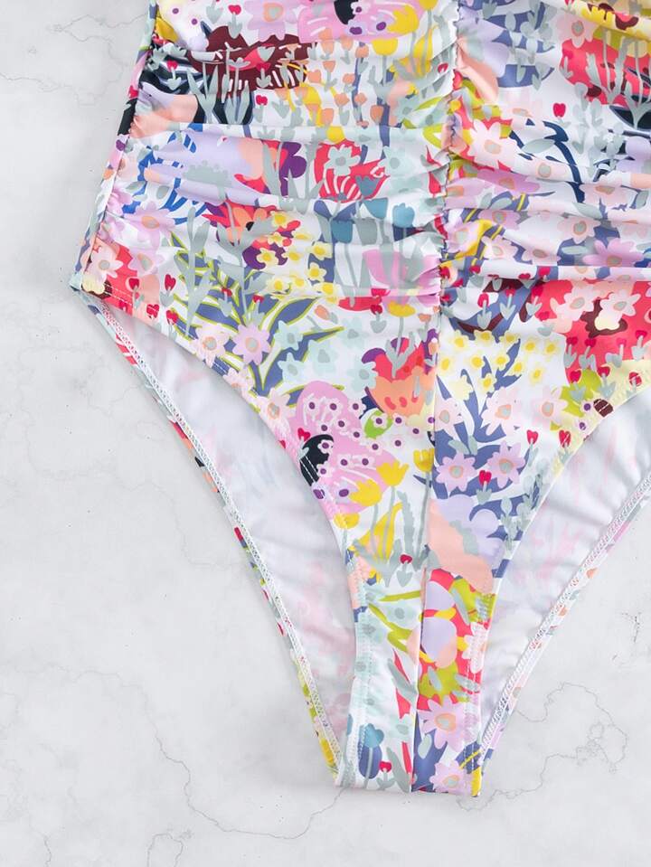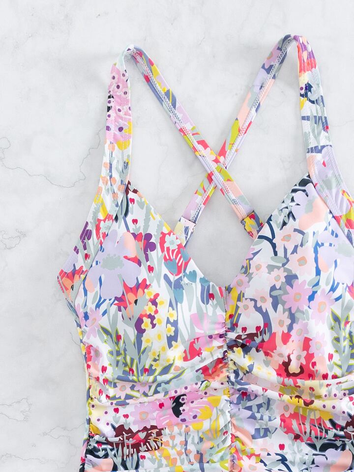 Bañador una pieza con estampado floral fruncido de espalda abierta con tira cruzada