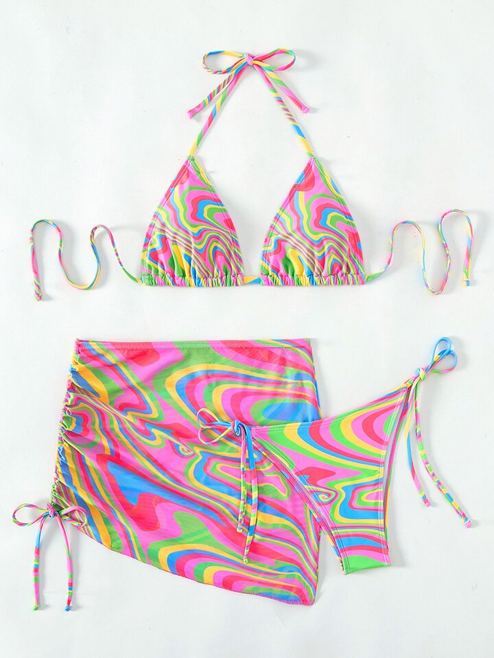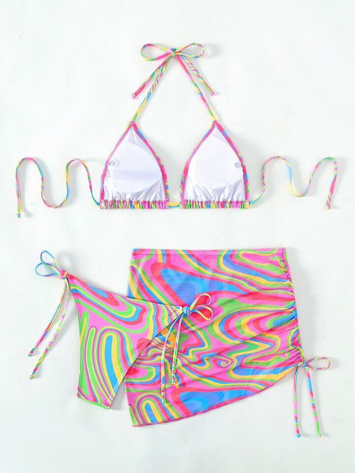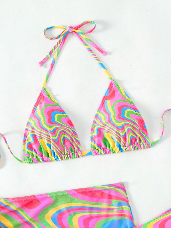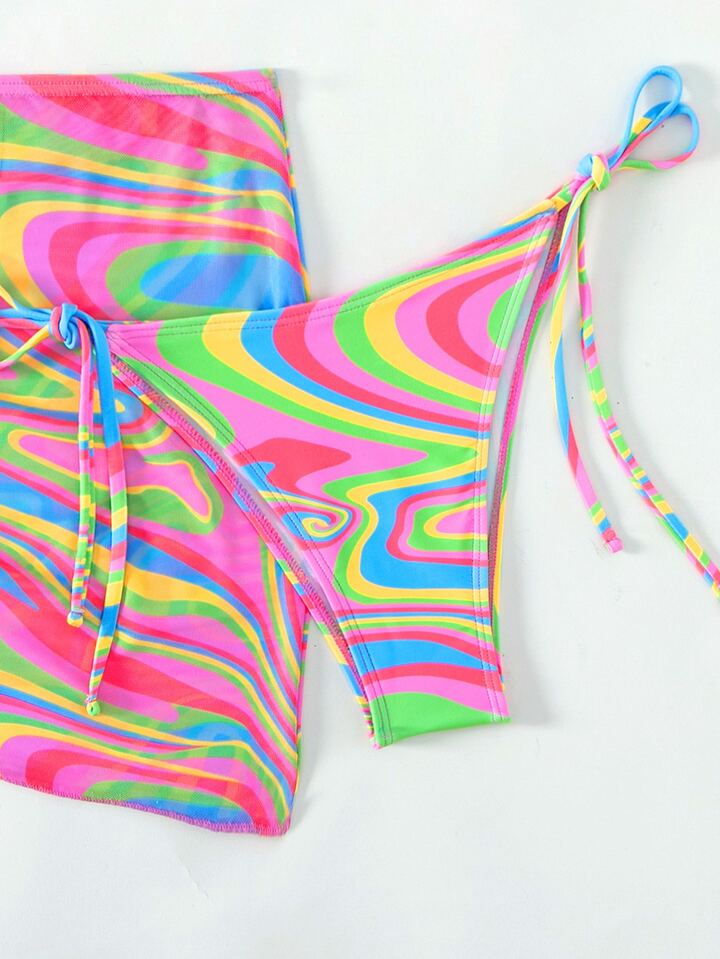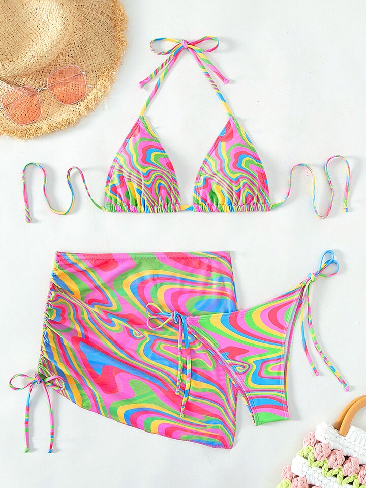 Conjunto de bikini veraniego de playa con diseño estampado completo en triángulo y sujetador de cuello halter y falda de playa.