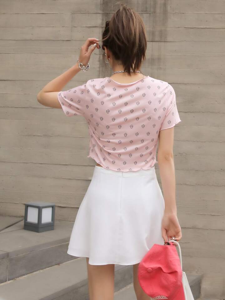 Camiseta corta con estampado de fresa ribete en forma de lechuga