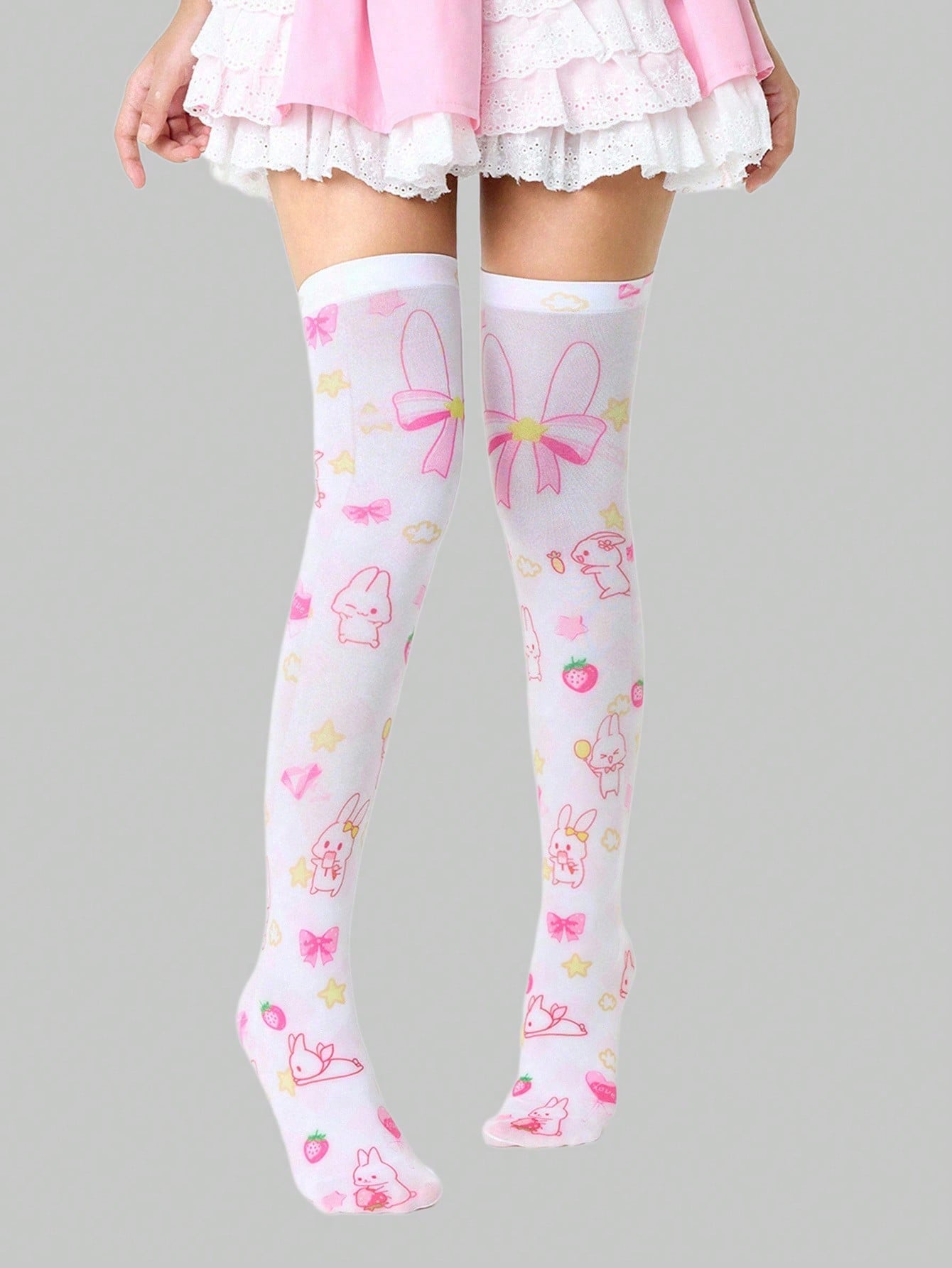 Anime 1 par de calcetines sobre la rodilla con patrón de dibujos animados lindos, estilo escolar dulce con lazo, conejo, fresa, elemento de estrella, calcetines altos de JK, mallas súper delgadas y elásticas