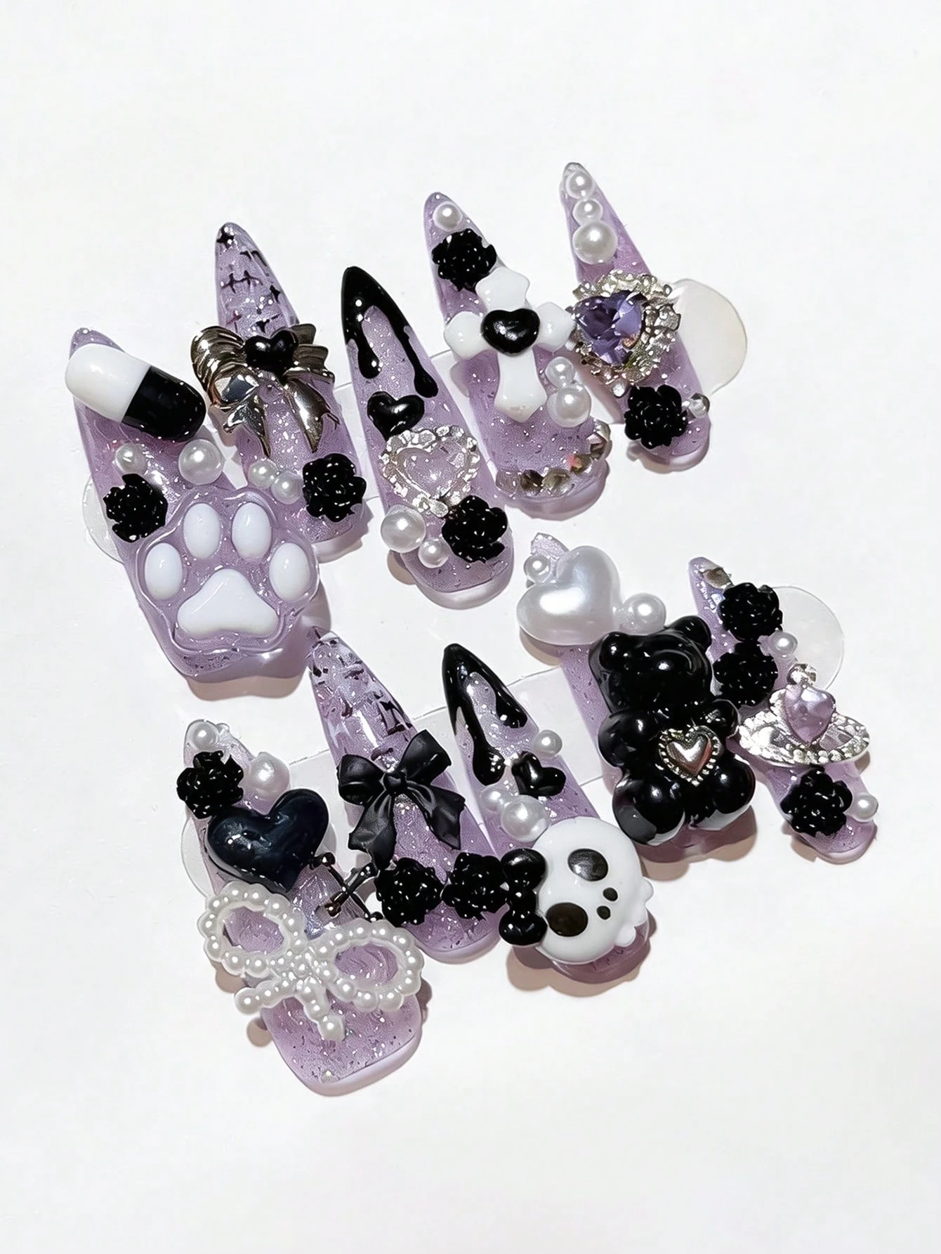 Anime 10 almohadillas de uñas postizas con lazo de oso de viento de estilo bidimensional y una pieza de cinta adhesiva doble cara