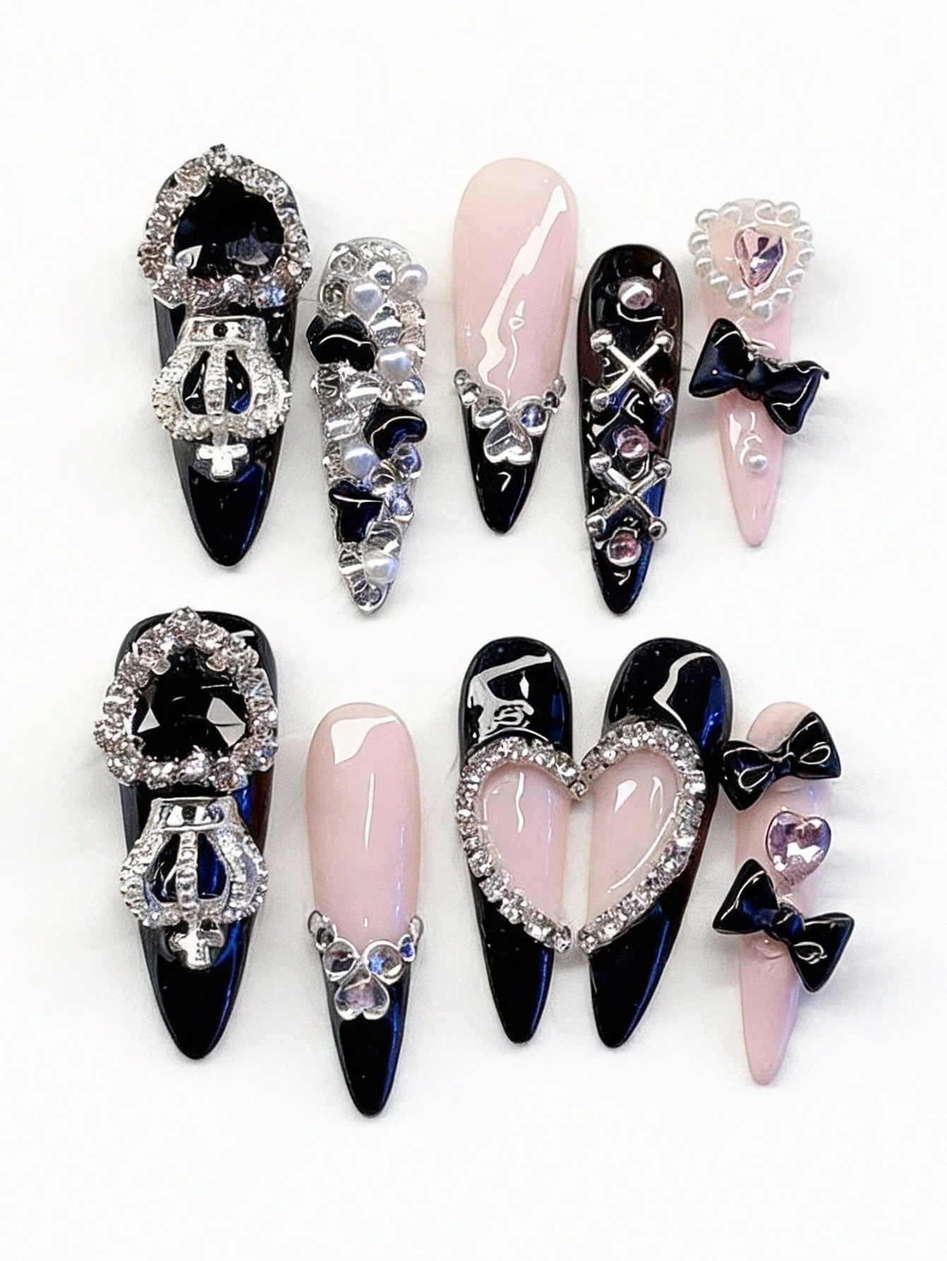 Anime 10 piezas de uñas postizas con lazo estilo Y2K y una pieza de cinta adhesiva doble cara