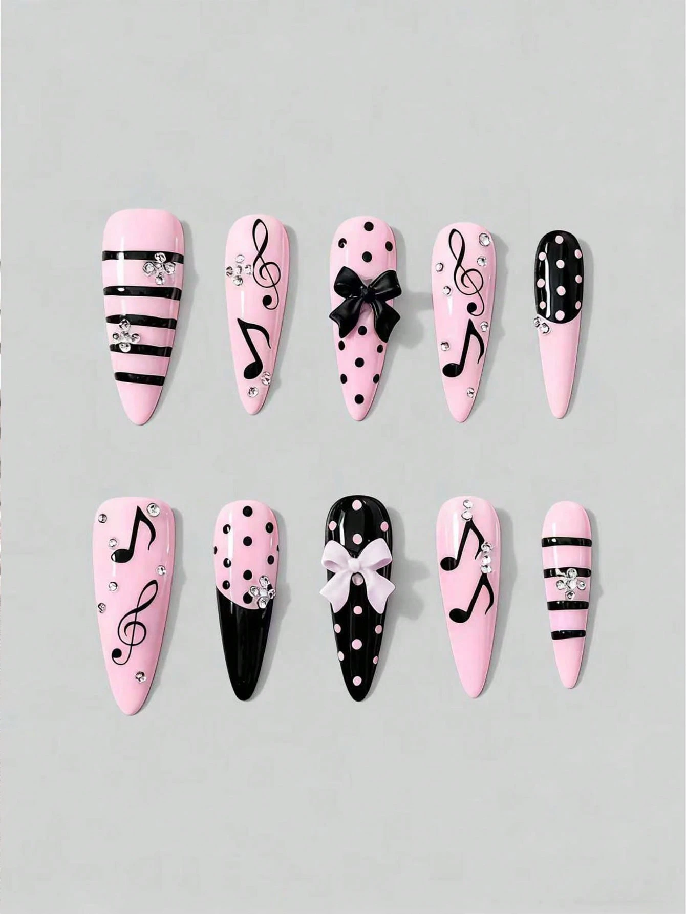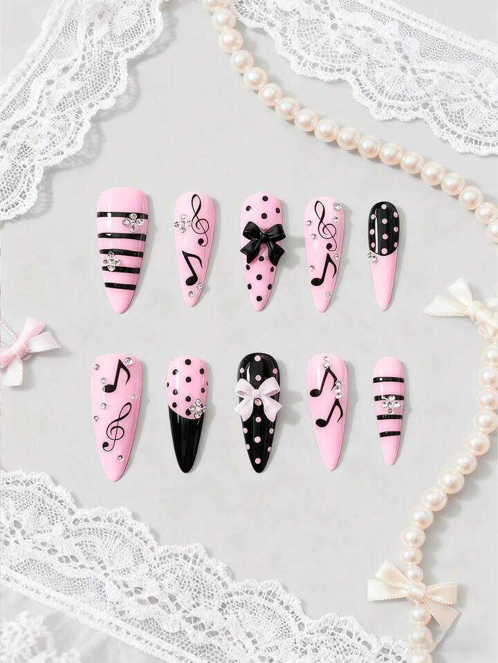 Anime 10 piezas de uñas postizas hechas a mano con moños lindos, notas musicales y lunares, + 3 piezas de adhesivo doble cara, uñas desmontables con forma de almendra, estilo francés dulce con cristales y lunares negros y rosas, adecuadas para vacaciones, fiestas y uso diario