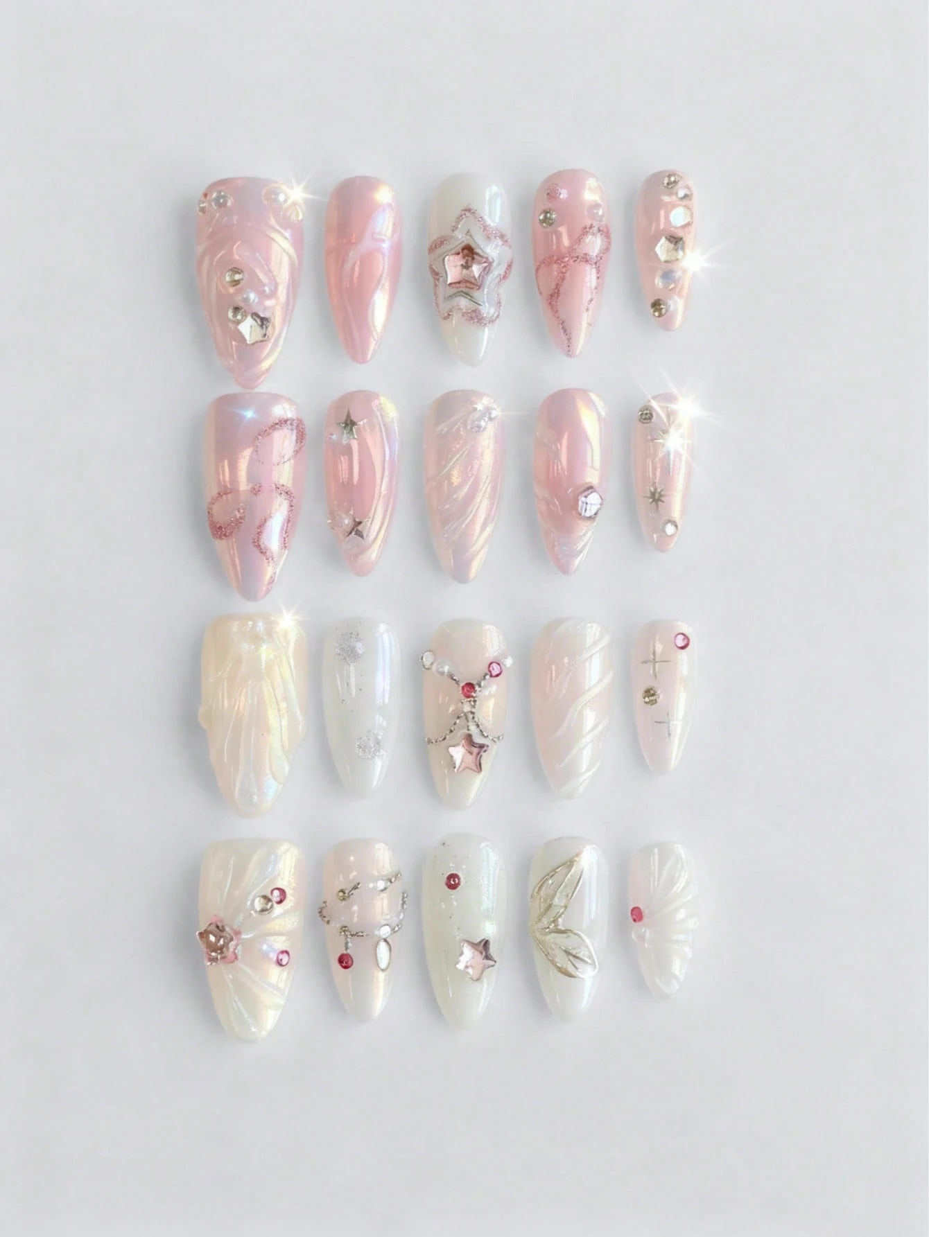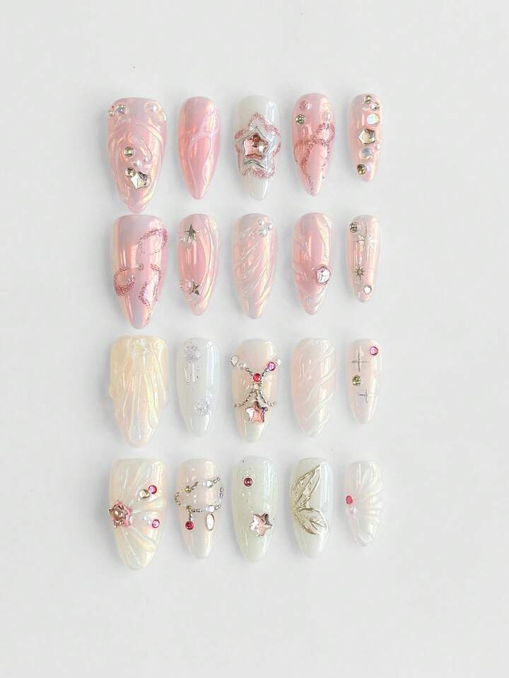 10 piezas de uñas postizas de alta calidad con elementos decorativos hechos a mano como alas, rosas, lazos, notas musicales y estrellas + 3 piezas de adhesivo doble cara, pegatinas de manicura extraíbles con estilo Y2K de cristales, lunares rosas y encaje blanco, adecuadas para vacaciones, fiestas, baile y uso diario