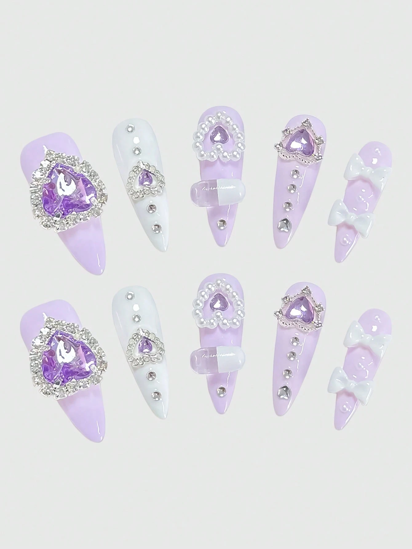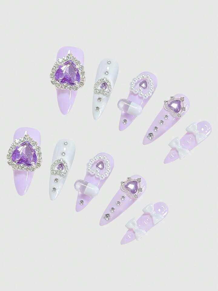 Anime 10 piezas de uñas falsas con corazones y moños estilo Y2K con 1 cinta de pegamento