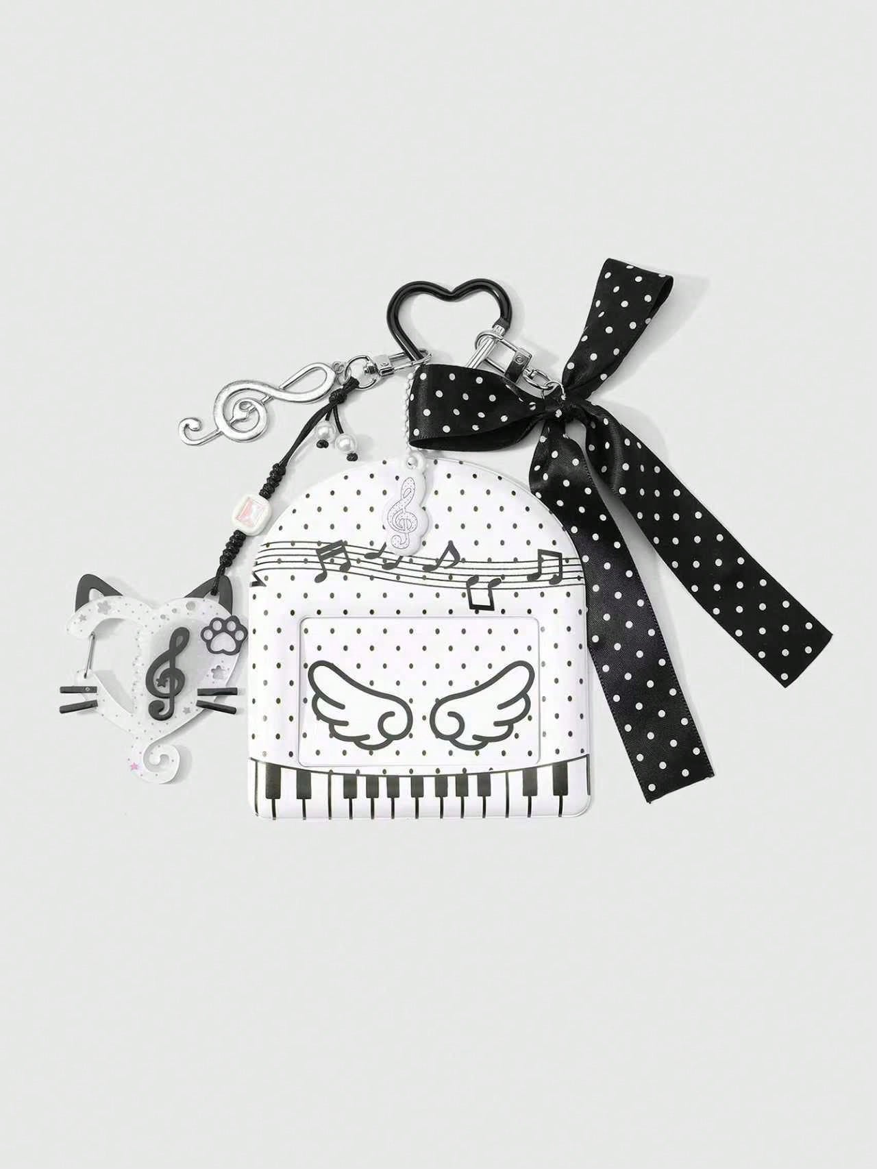 Anime 1 pieza Soporte horizontal de tarjetas de estilo Ins, casual y versátil, con un diseño minimalista retro de alta calidad con lunares en blanco y negro, lazo de cinta, nota musical hueca de acrílico, cuerda de cuero trenzado, teclado de piano brillante de PVC, adecuado para mujeres, niñas, amigos, uso diario, regalo de vacaciones