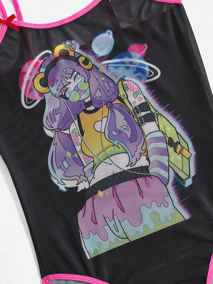 Anime Body teddy con estampado de figura de dibujos animados unido en contraste con diseño de lazo