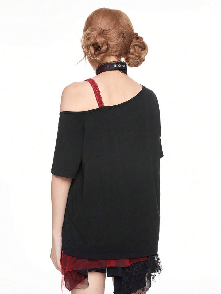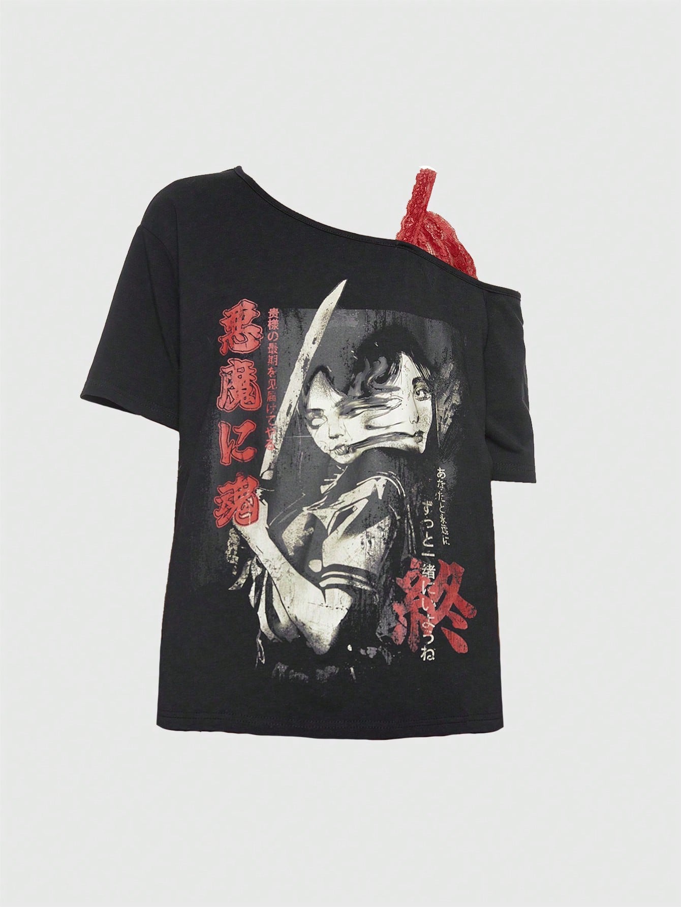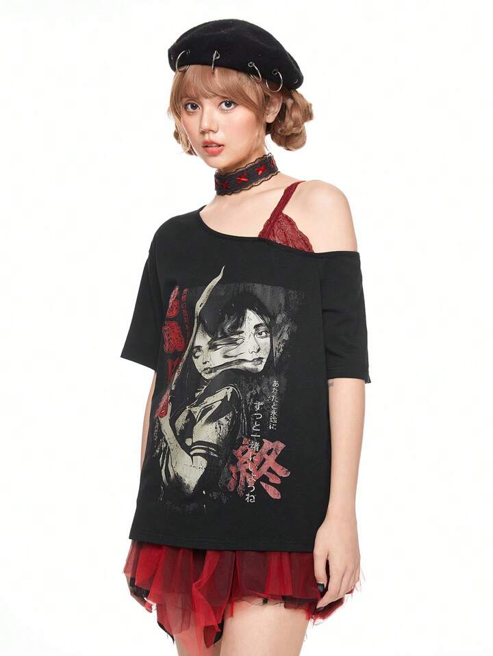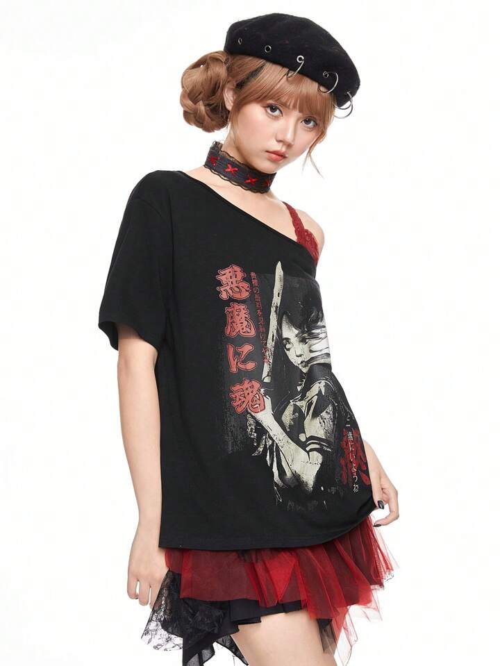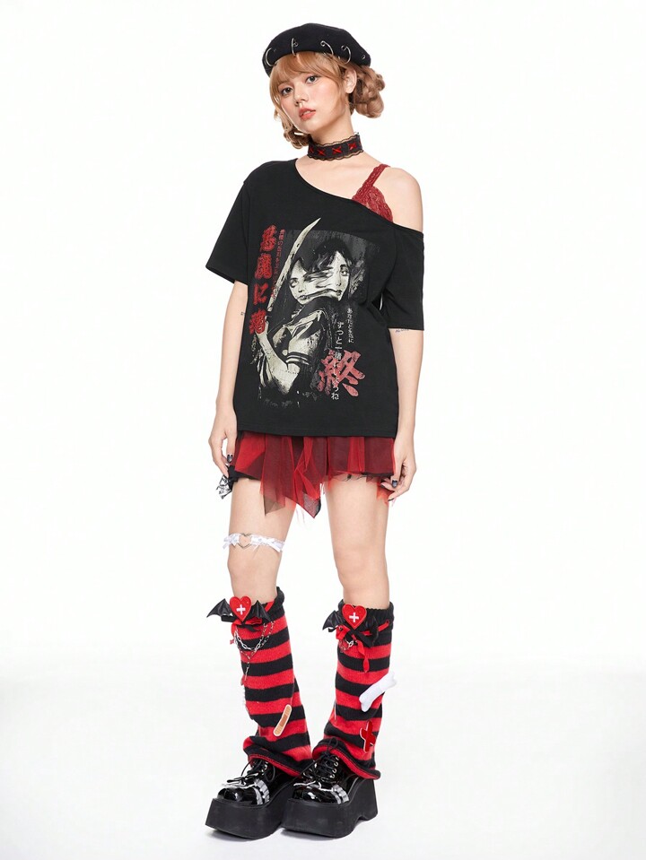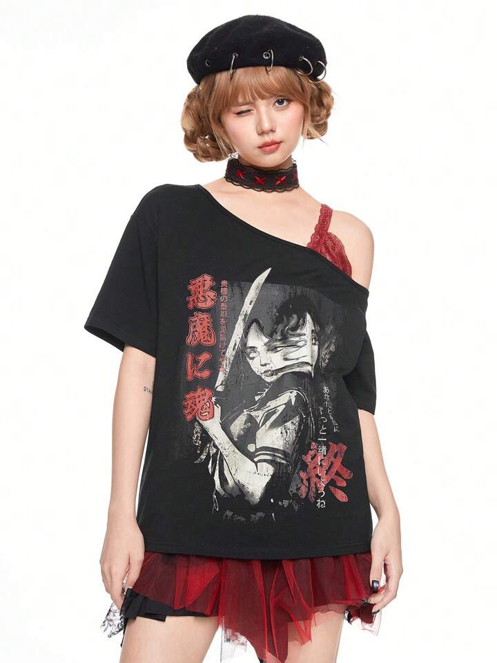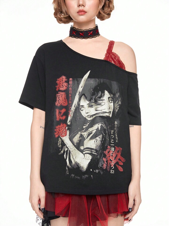 Anime Streetwear informal Estampado de dibujos animados de terror Hombro asimétrico 2 en 1