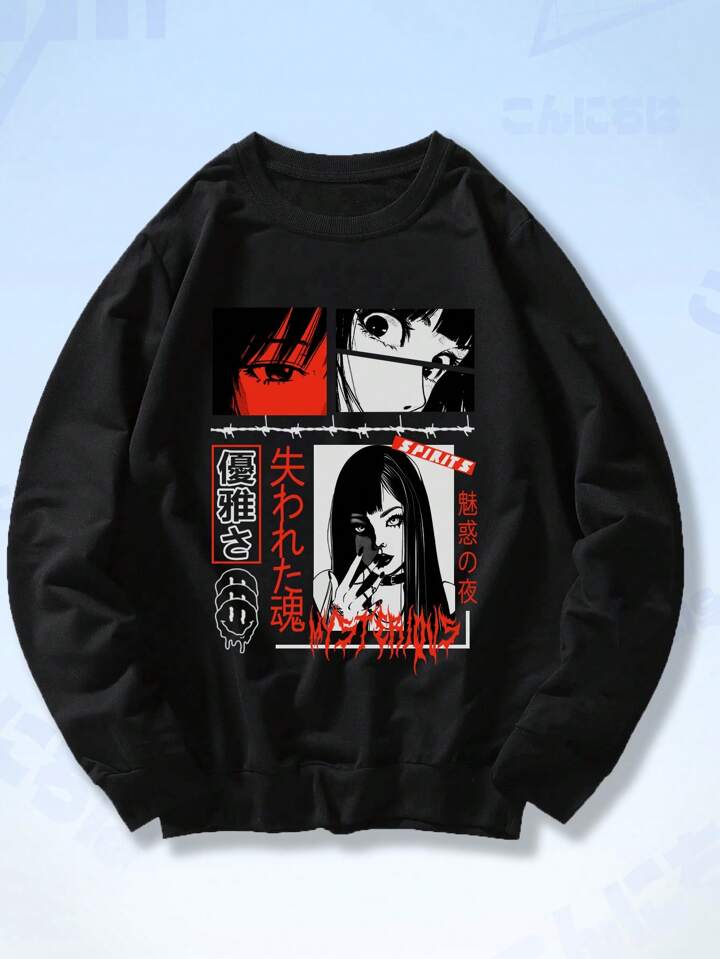 Anime Hombres Sudadera con estampado de letra japonesa y figura