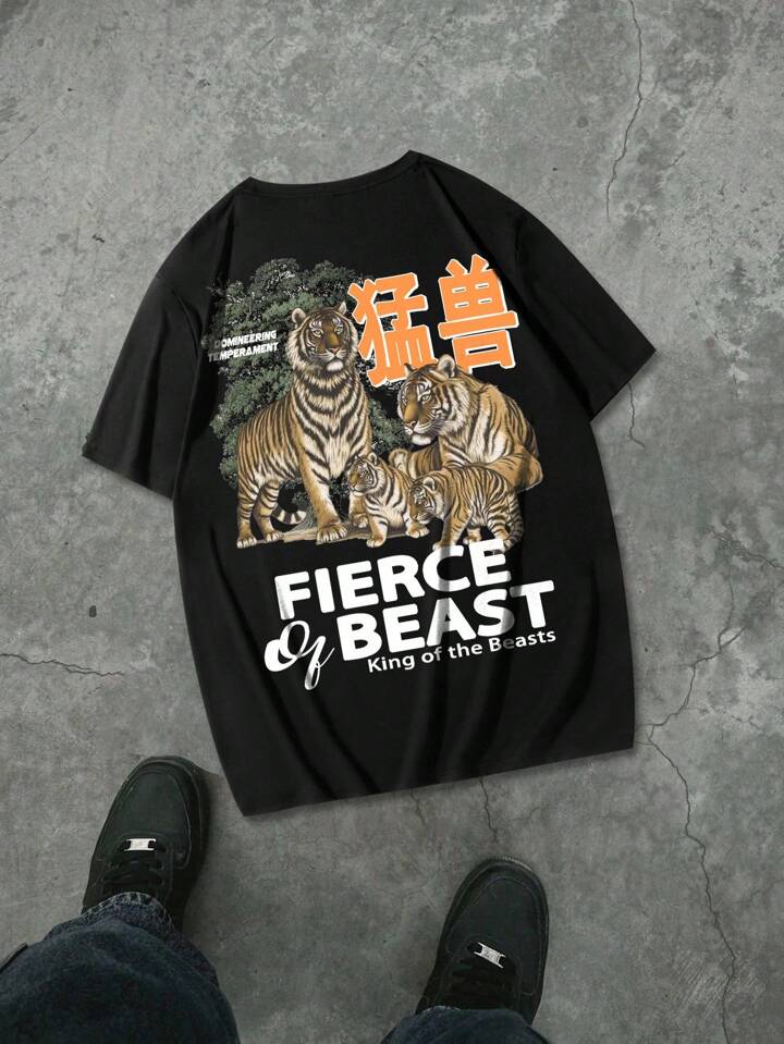 Anime Camiseta negra casual de marca con estampado de tigre, el rey de las bestias, para uso diario en el estilo urbano joven