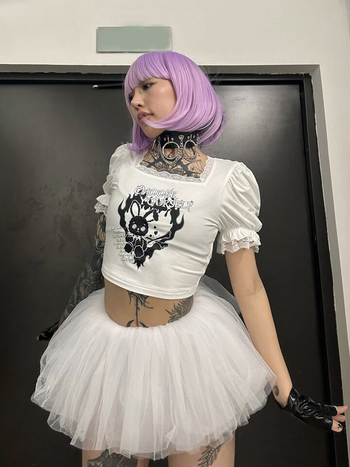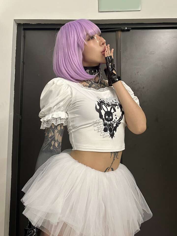 Anime Camiseta crop con letra con estampado de conejo con encaje en contraste