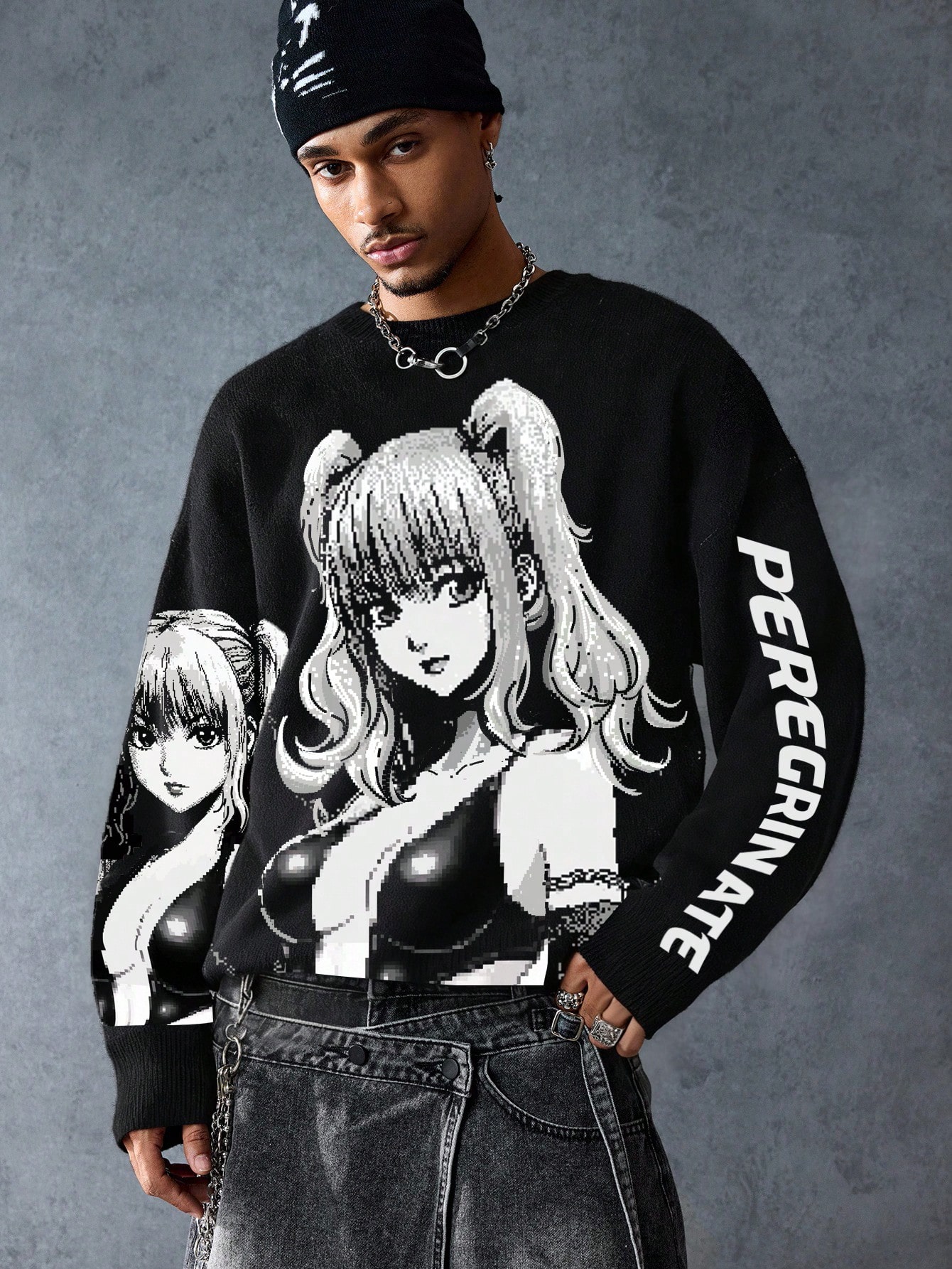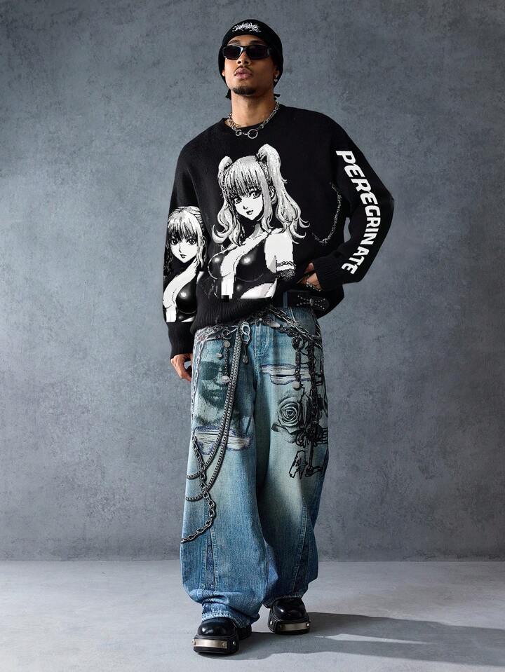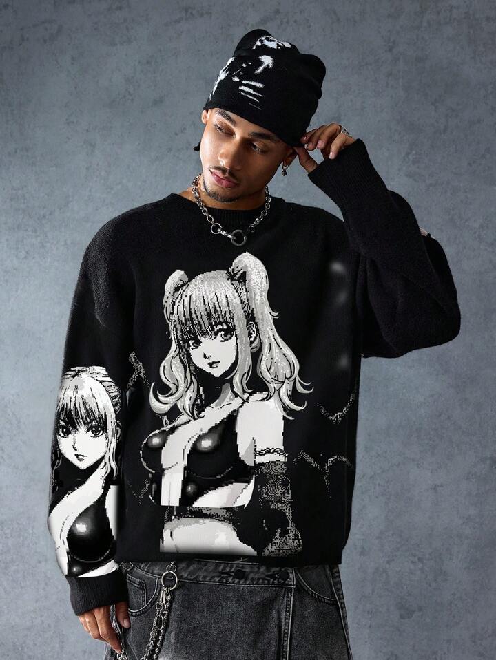 Anime Suéter holgado de estilo casual para hombre con estampado de letra de personaje de dibujos animados, cuello redondo, hombros caídos y manga larga, de estilo grunge, para otoño