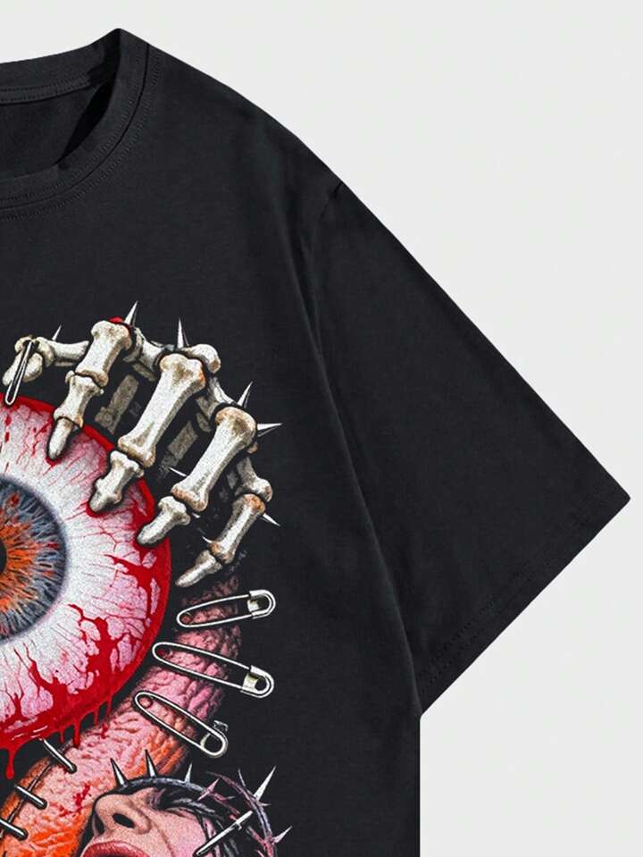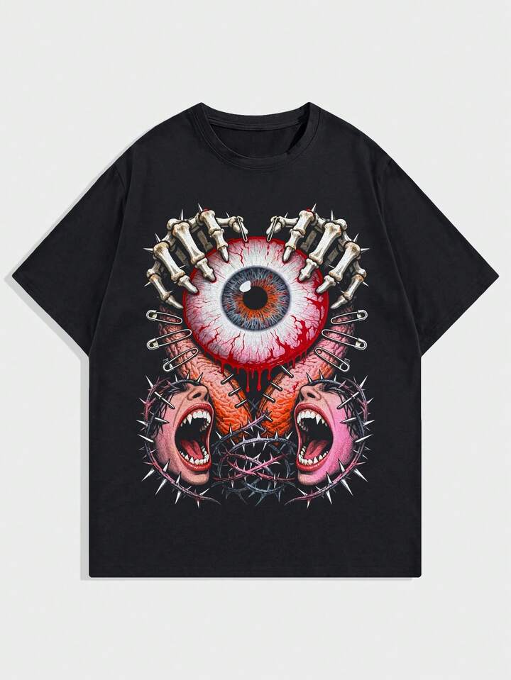 Anime Camiseta de manga corta de cuello redondo con estampado de boca y ojo, casual para hombre, de verano