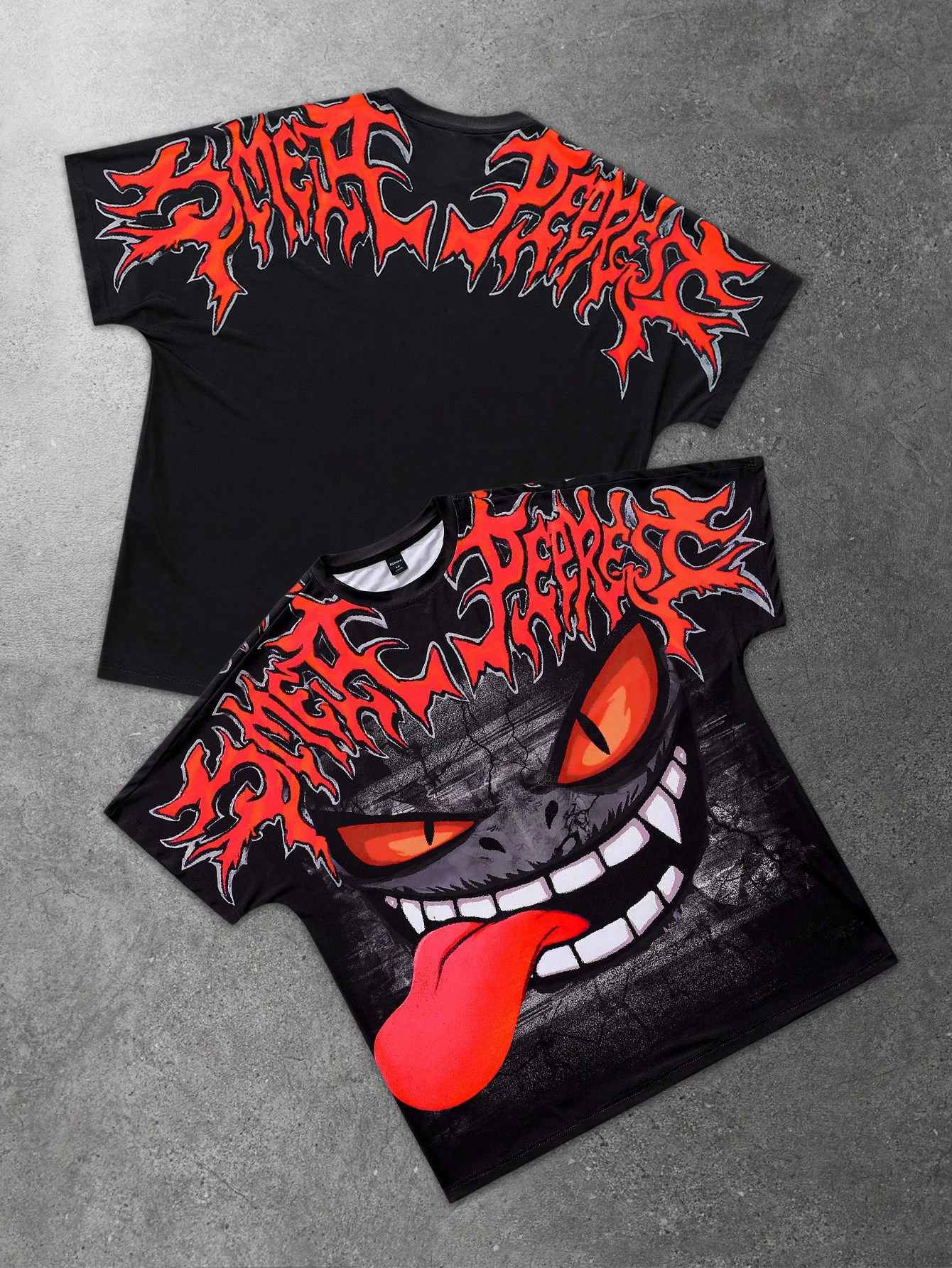 Anime Camiseta de manga de murciélago con estampado de letra de dibujos animados de moda para hombres, verano