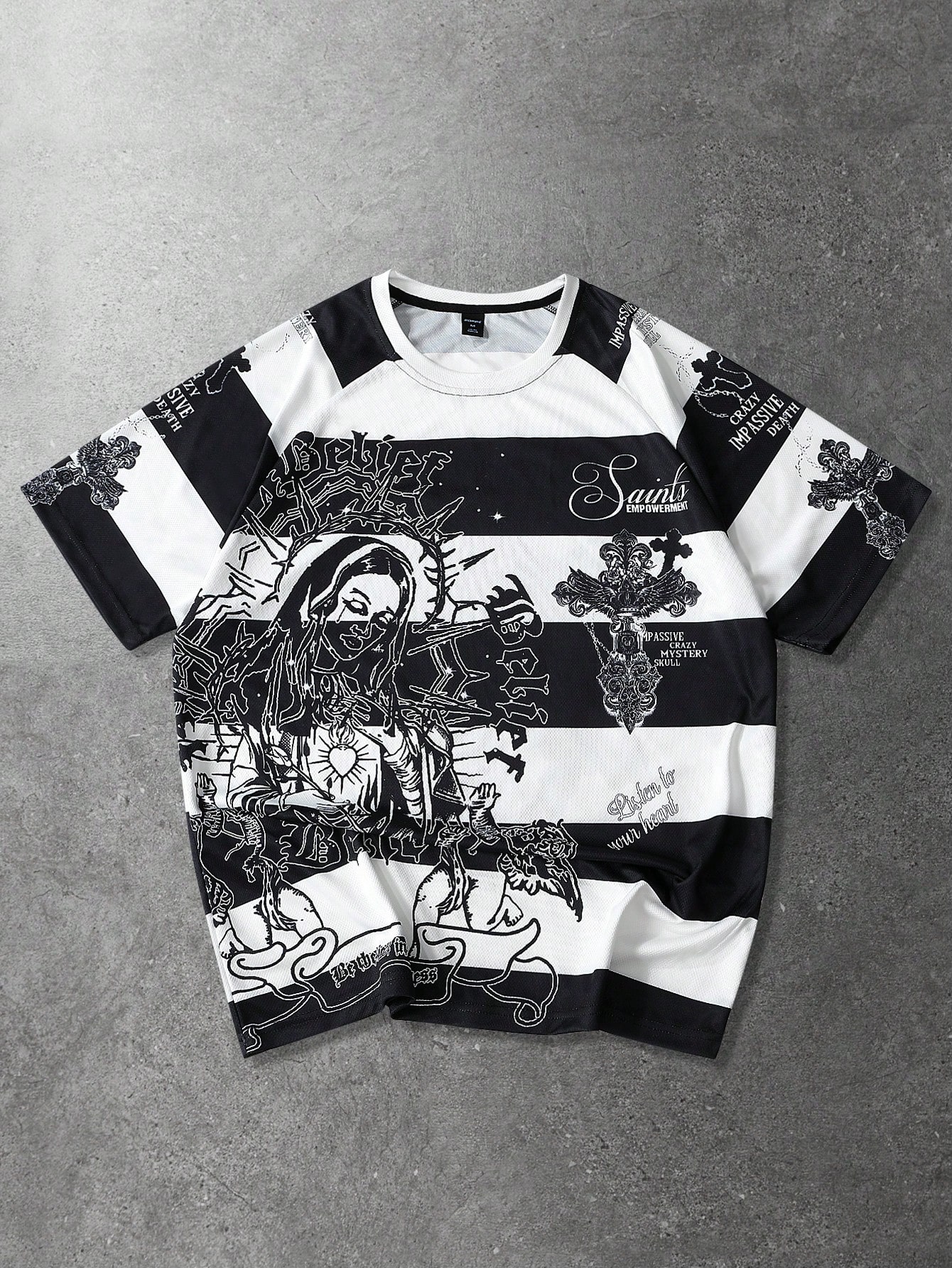 Anime Camiseta de manga corta con cuello redondo, estampado de letras y rayas, para hombre
