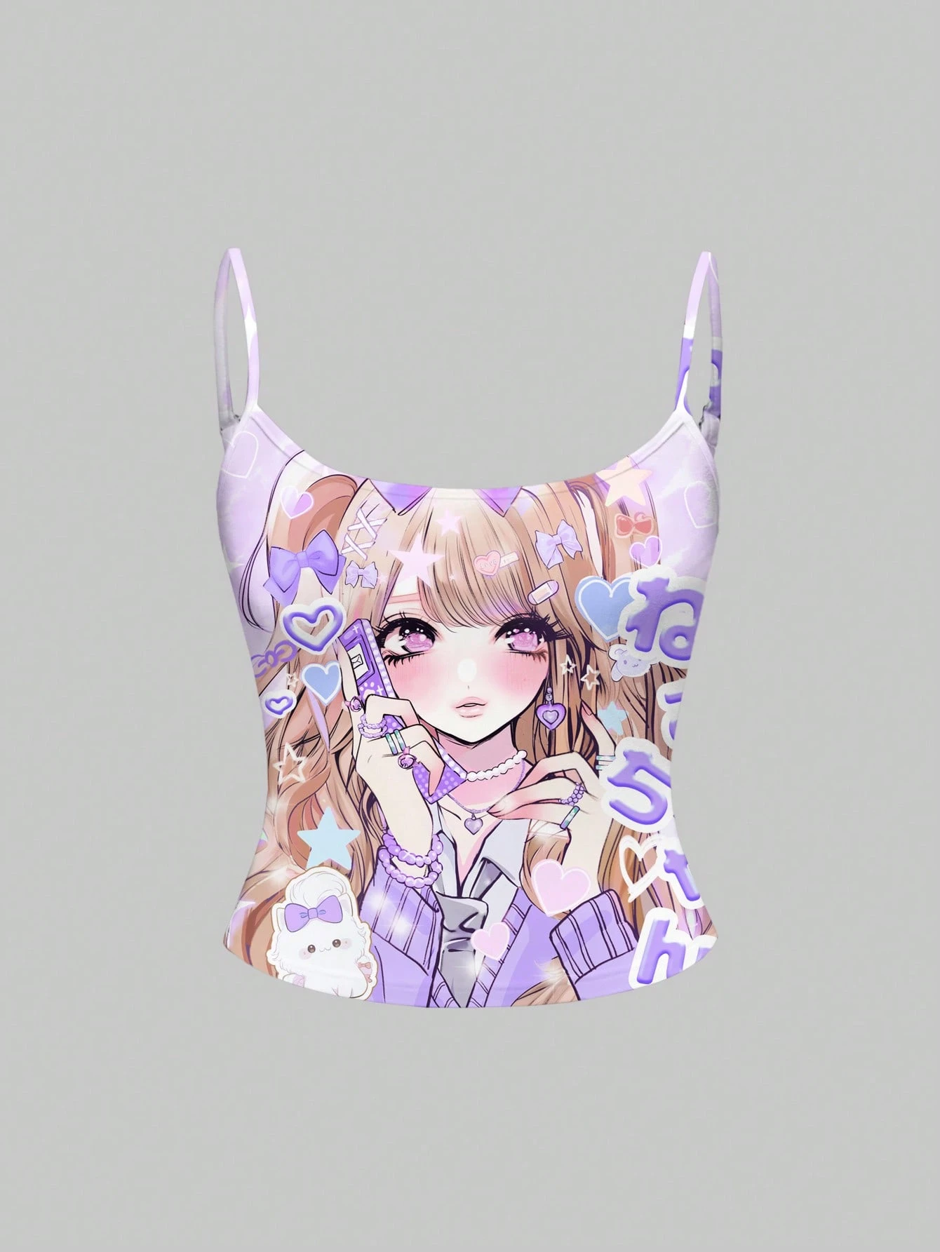 Anime Top sexy de señora con estampados de personaje de dibujos animados Kawaii, moño y paleta, color morado adecuado para salir