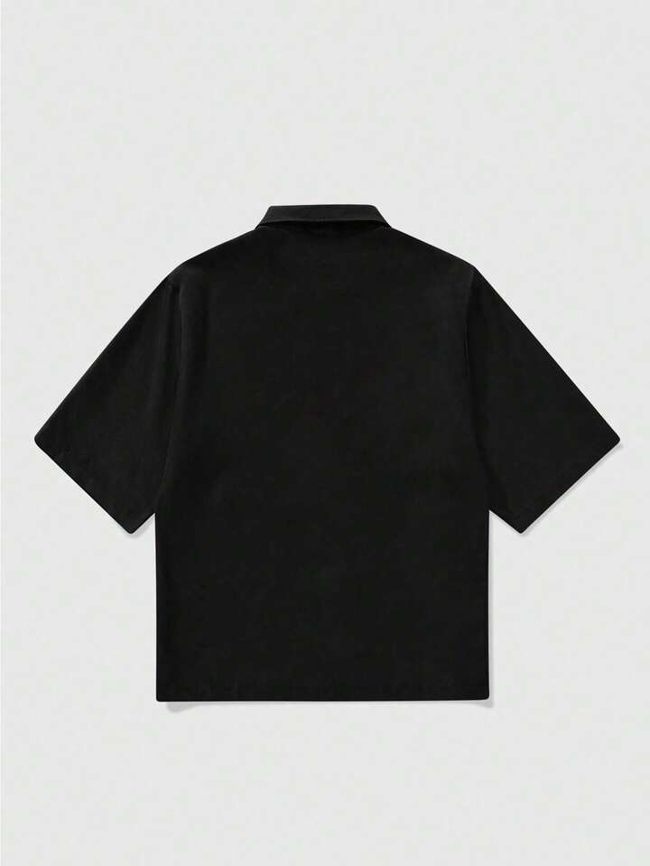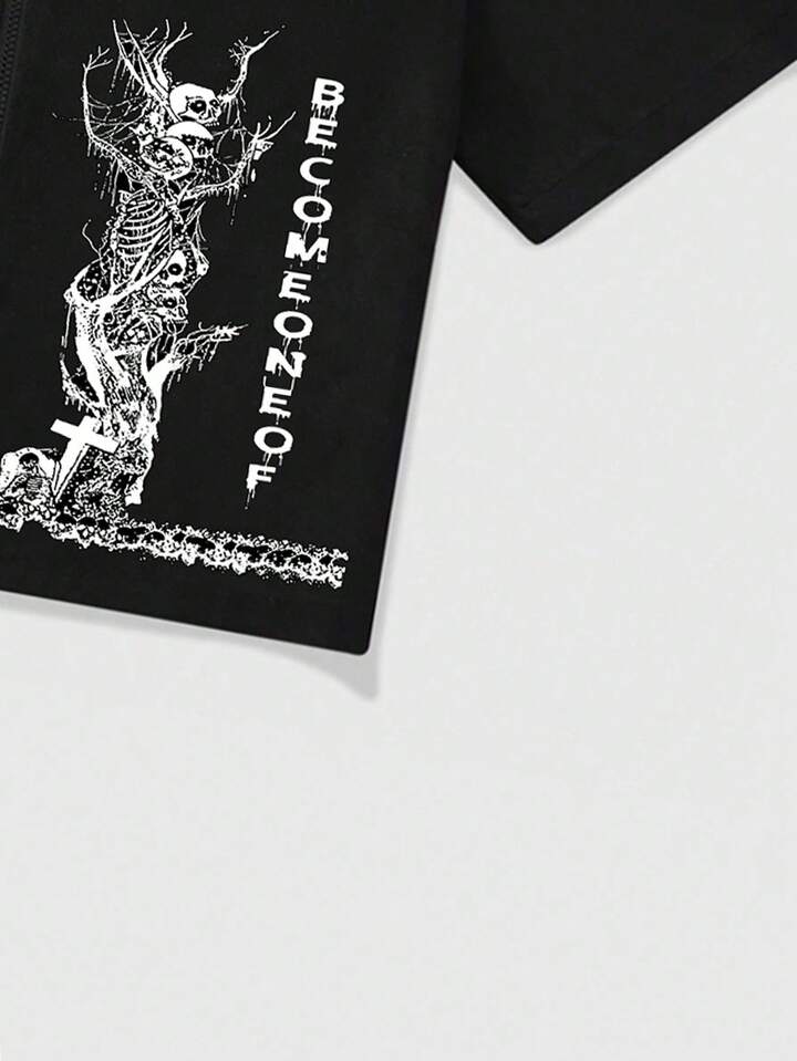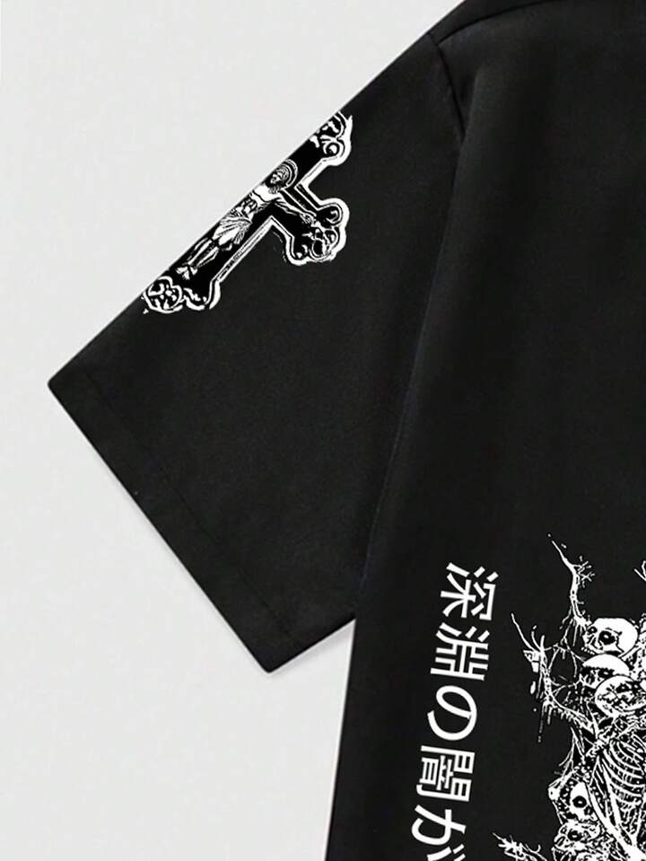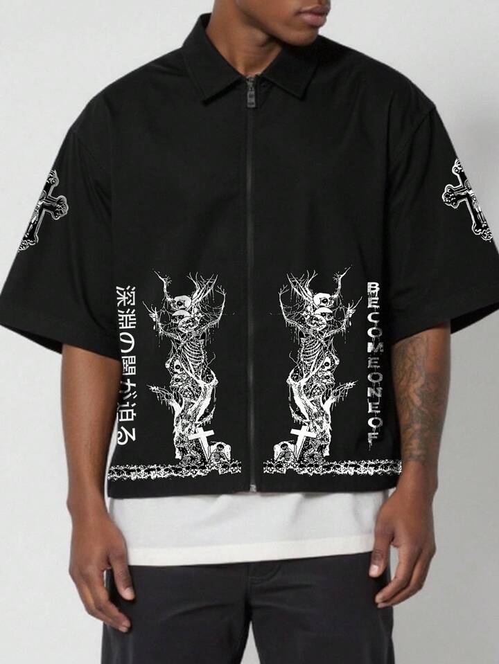 Anime Camisa negra con cremallera de estilo casual de verano para hombres con patrón de árbol de calavera y cruz