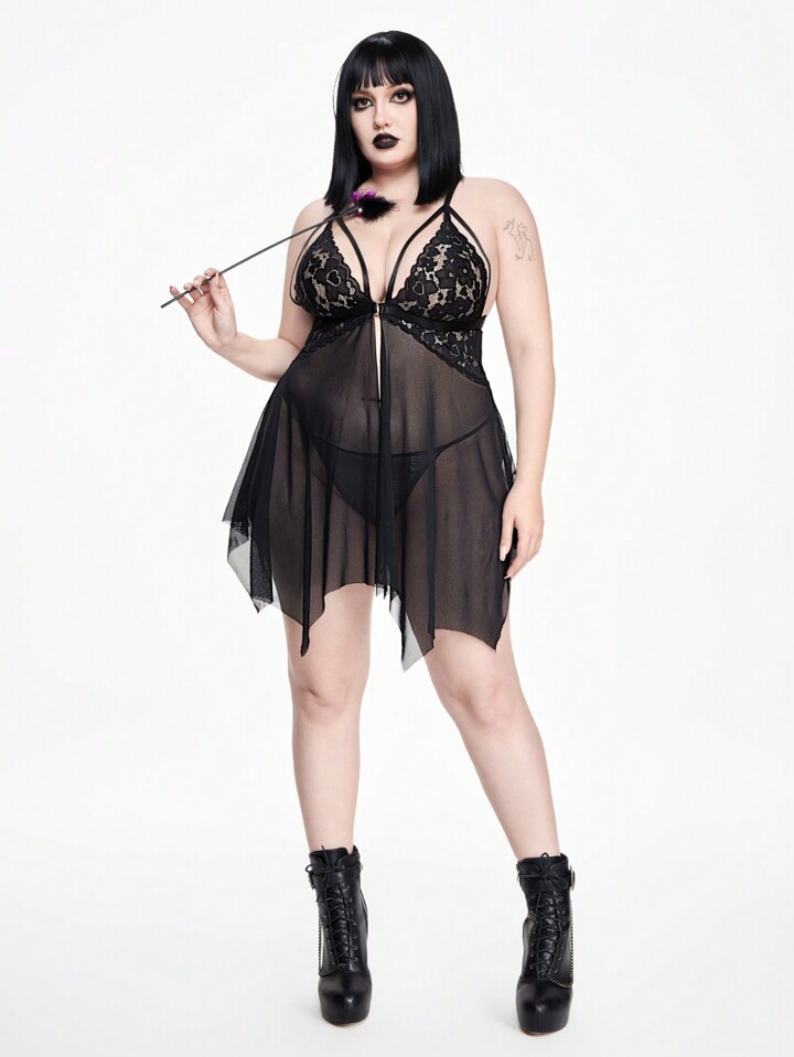 Goth Conjunto de vestido asimétrico sexy con encaje y malla gótica
