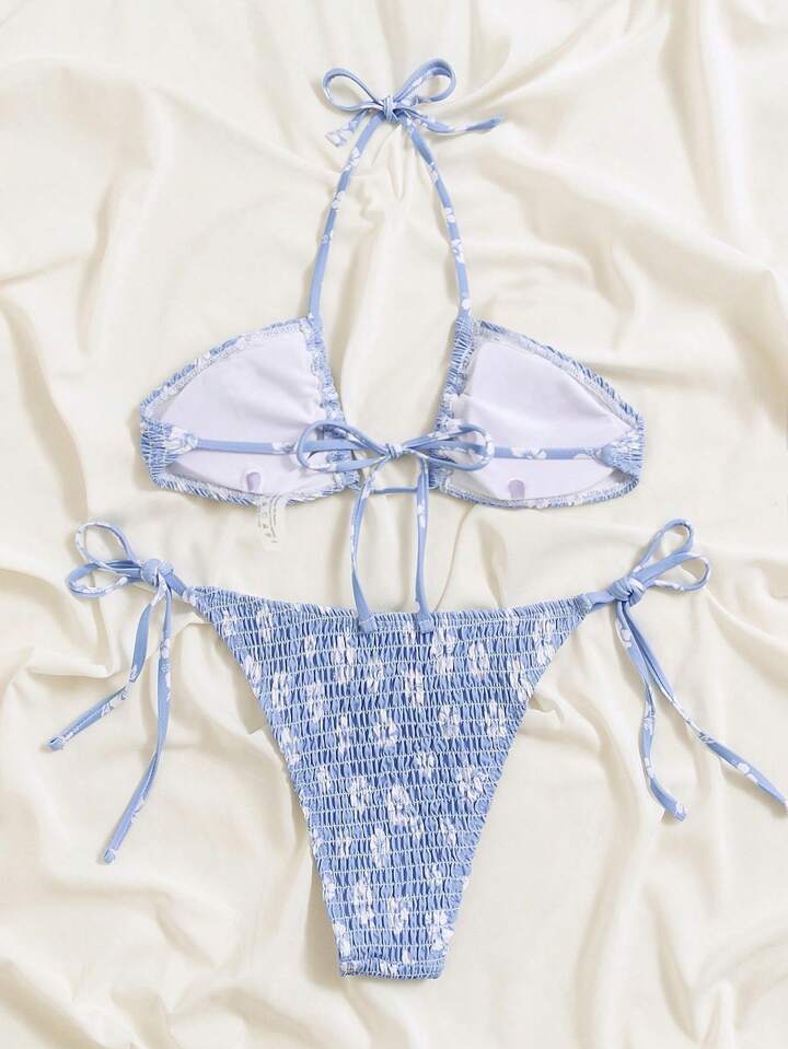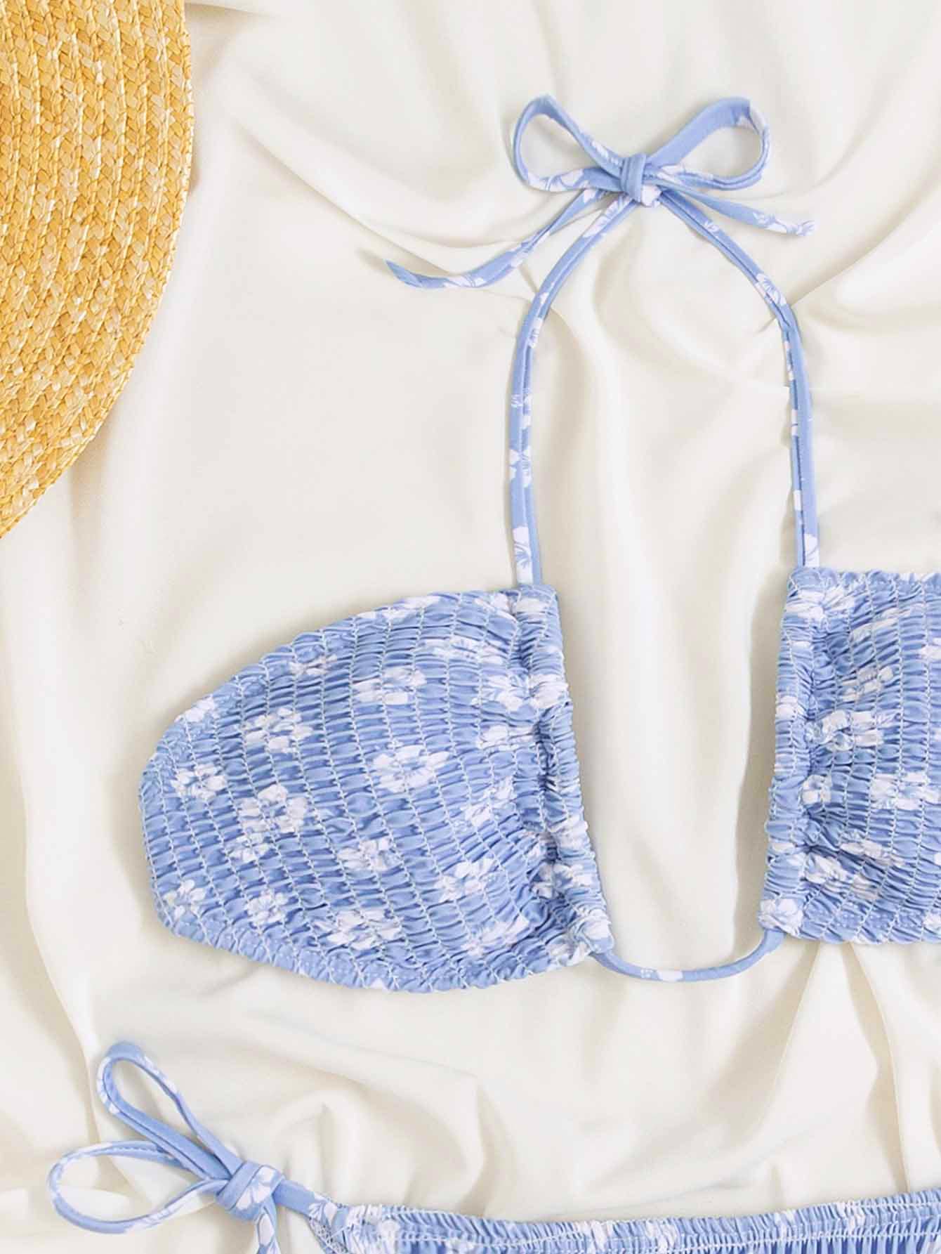 Traje de baño de mujer Conjunto de bikini de 2 piezas con estampado floral tipo Ditsy, sujetador con escote halter y tanga, para verano y playa