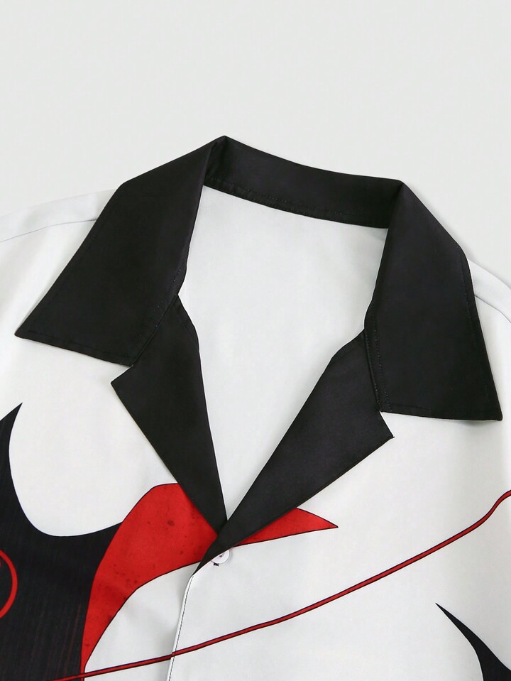 Batman X ROMWE Camisa de manga corta con cuello de solapa de contraste con estampado de personaje de anime para hombre, verano