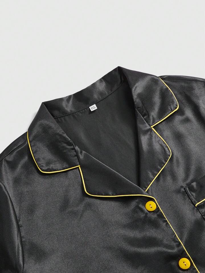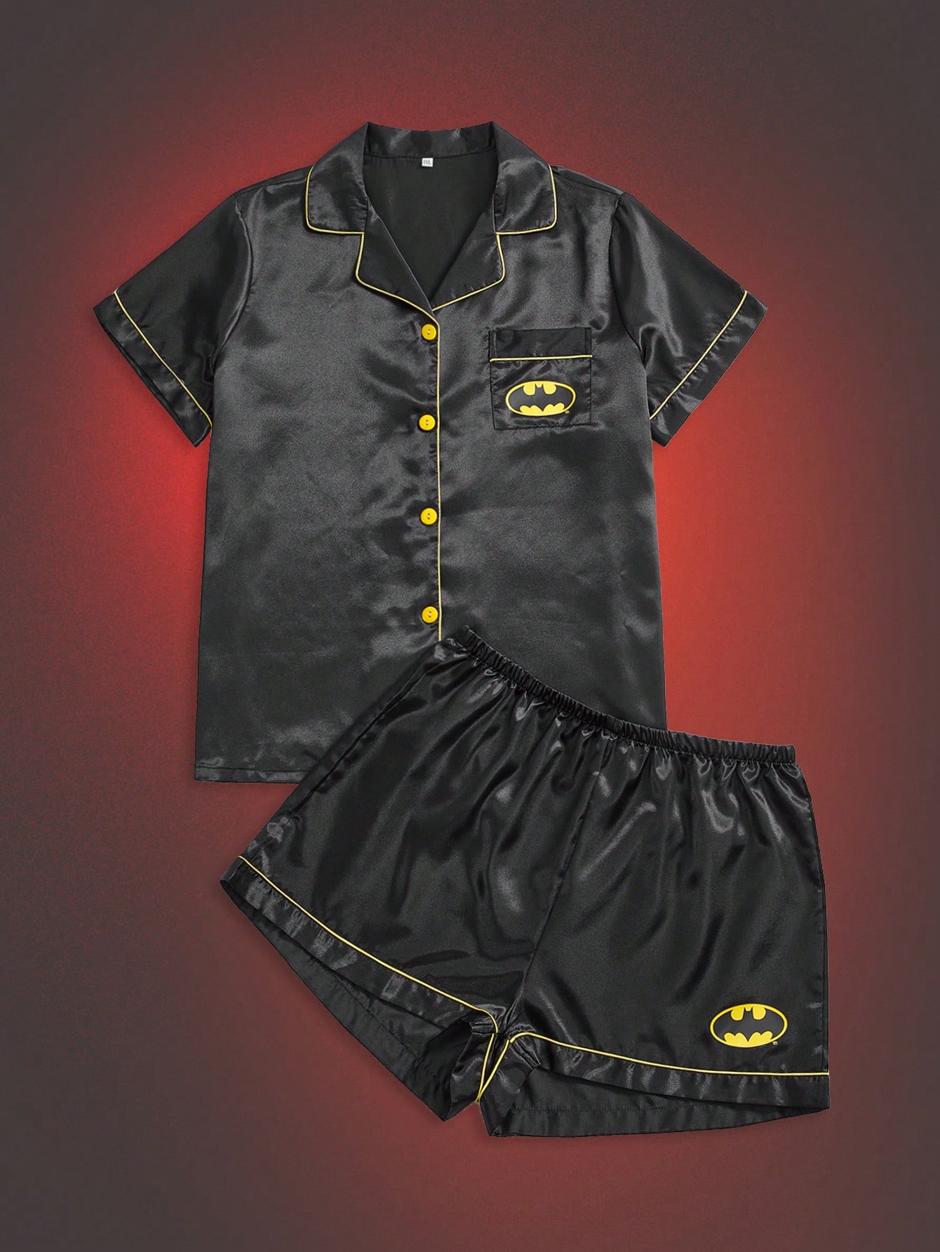 Batman X ROMWE Conjunto de pijama de parte superior de manga corta con solapa y estampado de murciélago, y shorts, con ribete contrastante de satén, casual y cómodo para el verano, tallas grandes