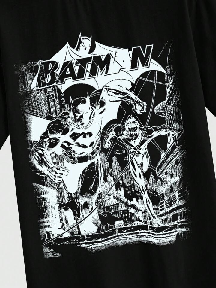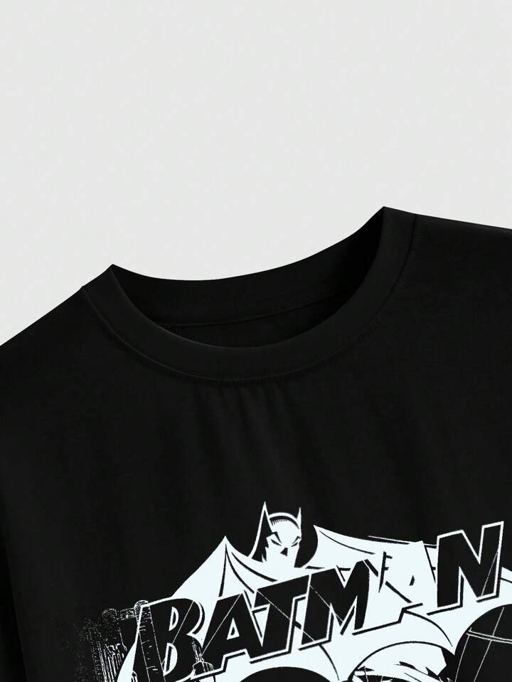 Batman X ROMWE Camiseta de manga corta de cuello redondo con gráficos de silueta, de corte holgado, casual, para verano, para mujer