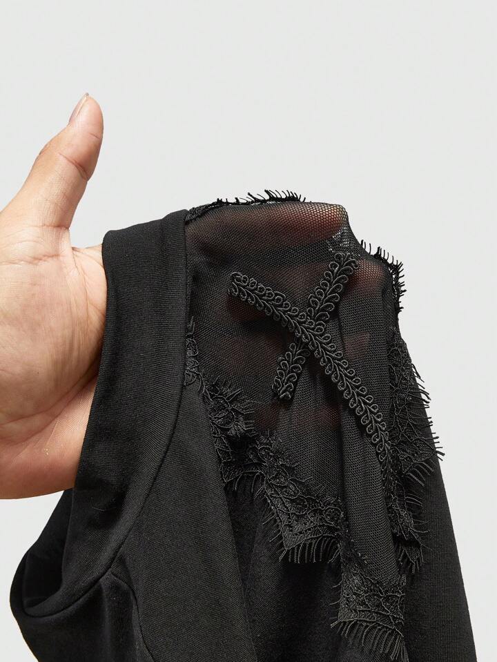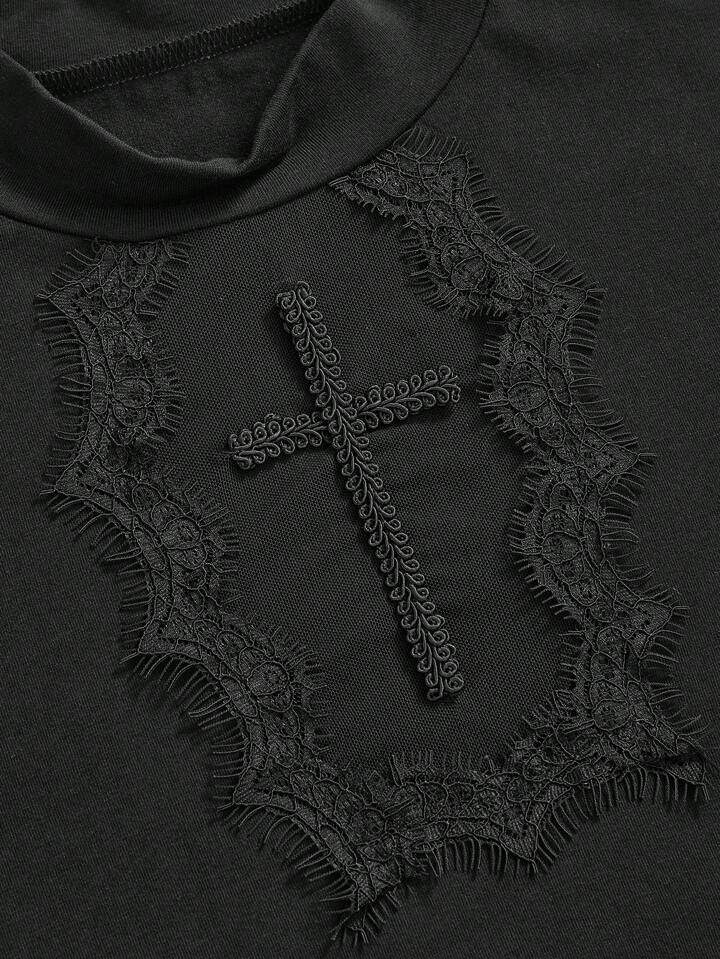 Goth Camiseta gótica oscura de talla grande con aplicación de cruz, escote transparente y ribete de encaje para estilo gótico de playa