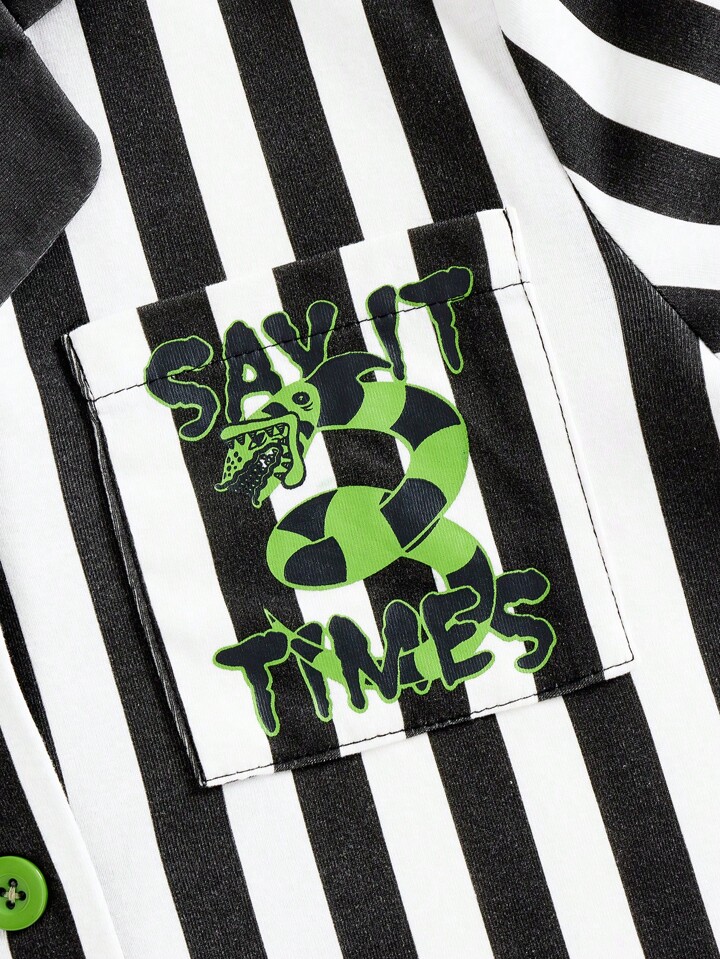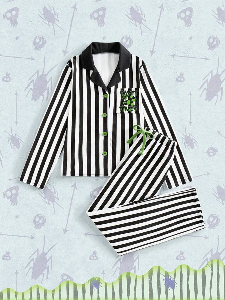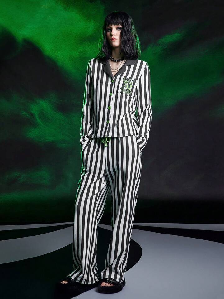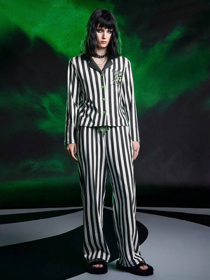 Beetlejuice | ROMWE Conjunto de pijama con camisa de manga larga con cuello de solapa de bloques de color y rayas, y pantalón largo para mujeres, otoño e invierno