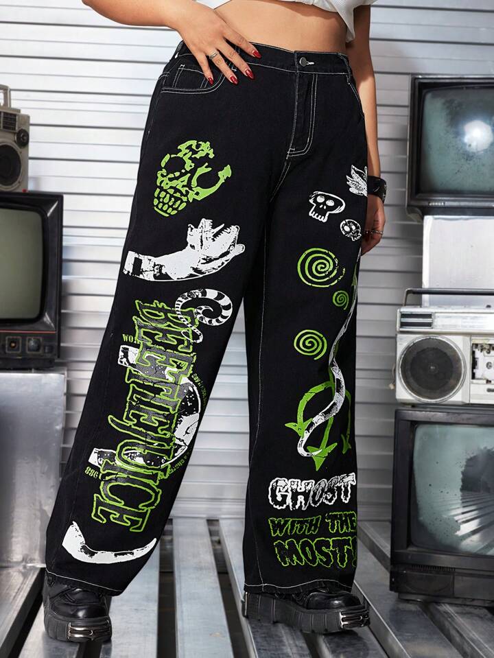 Beetlejuice | ROMWE Jeans de pierna ancha de moda casual de calle con estampado total para talla grande