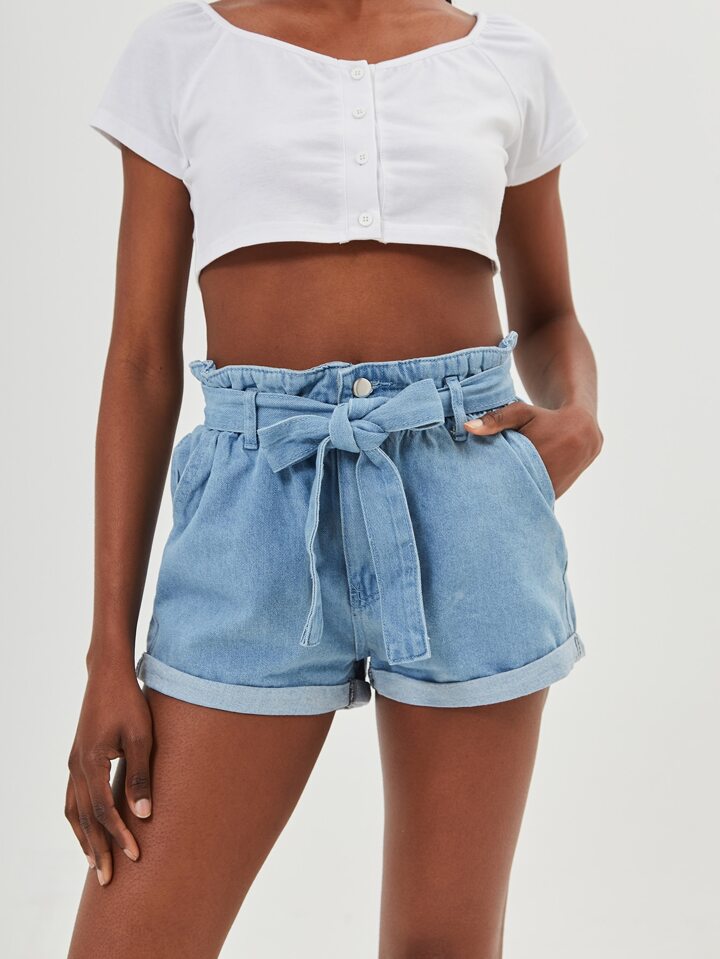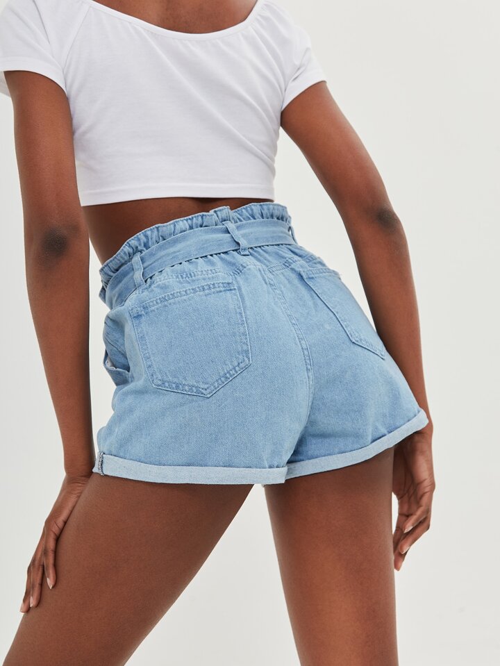 Shorts mezclilla de doblez con cinturón de cintura con volante