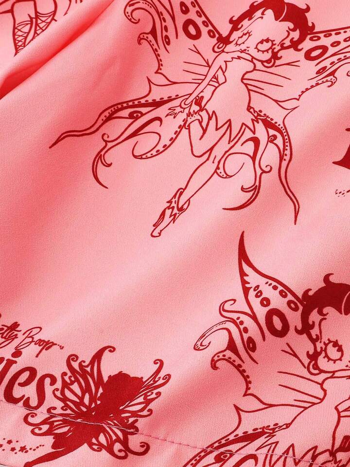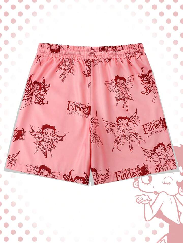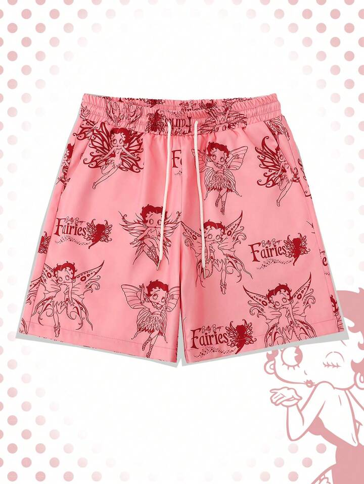 Betty Boop | ROMWE Pantalones cortos sueltos casuales de verano para hombre con impresión de personajes de caricaturas y letras y cintura ajustable con cordón.
