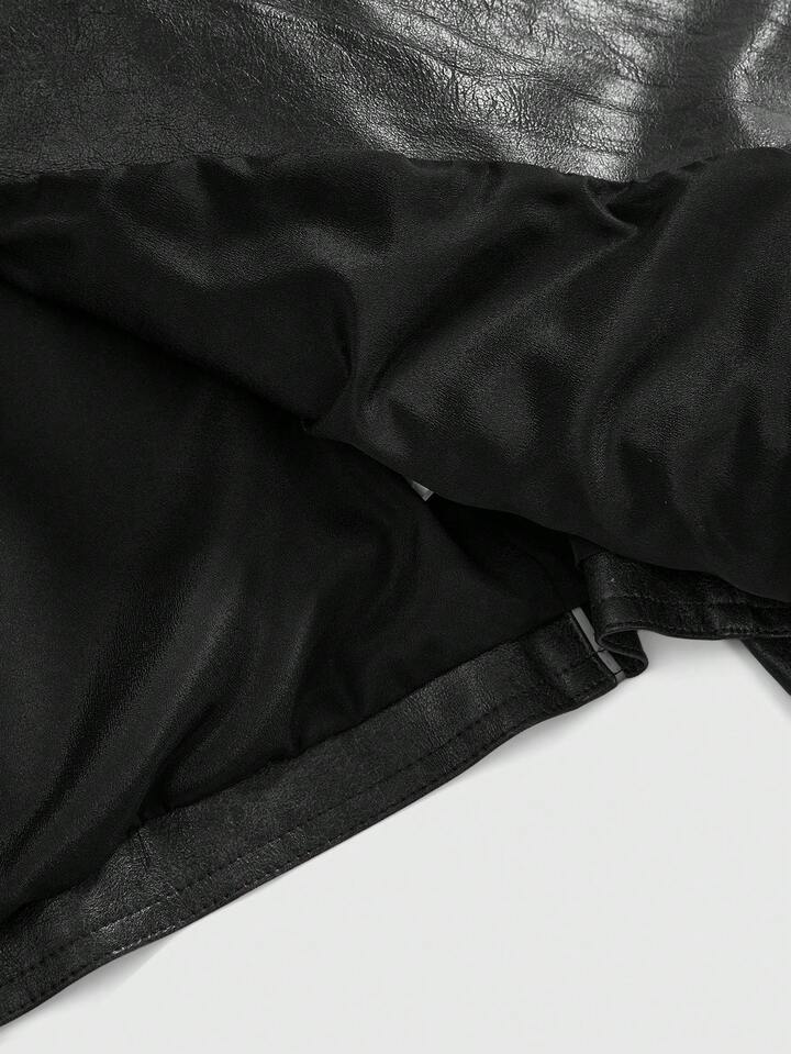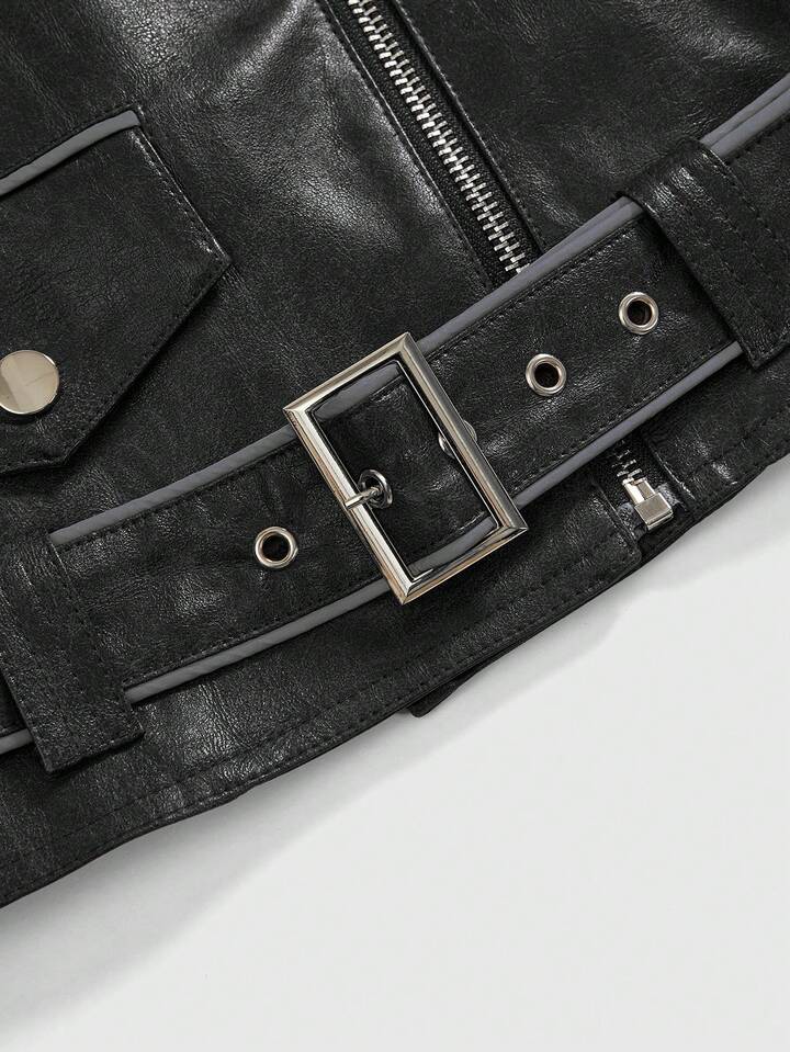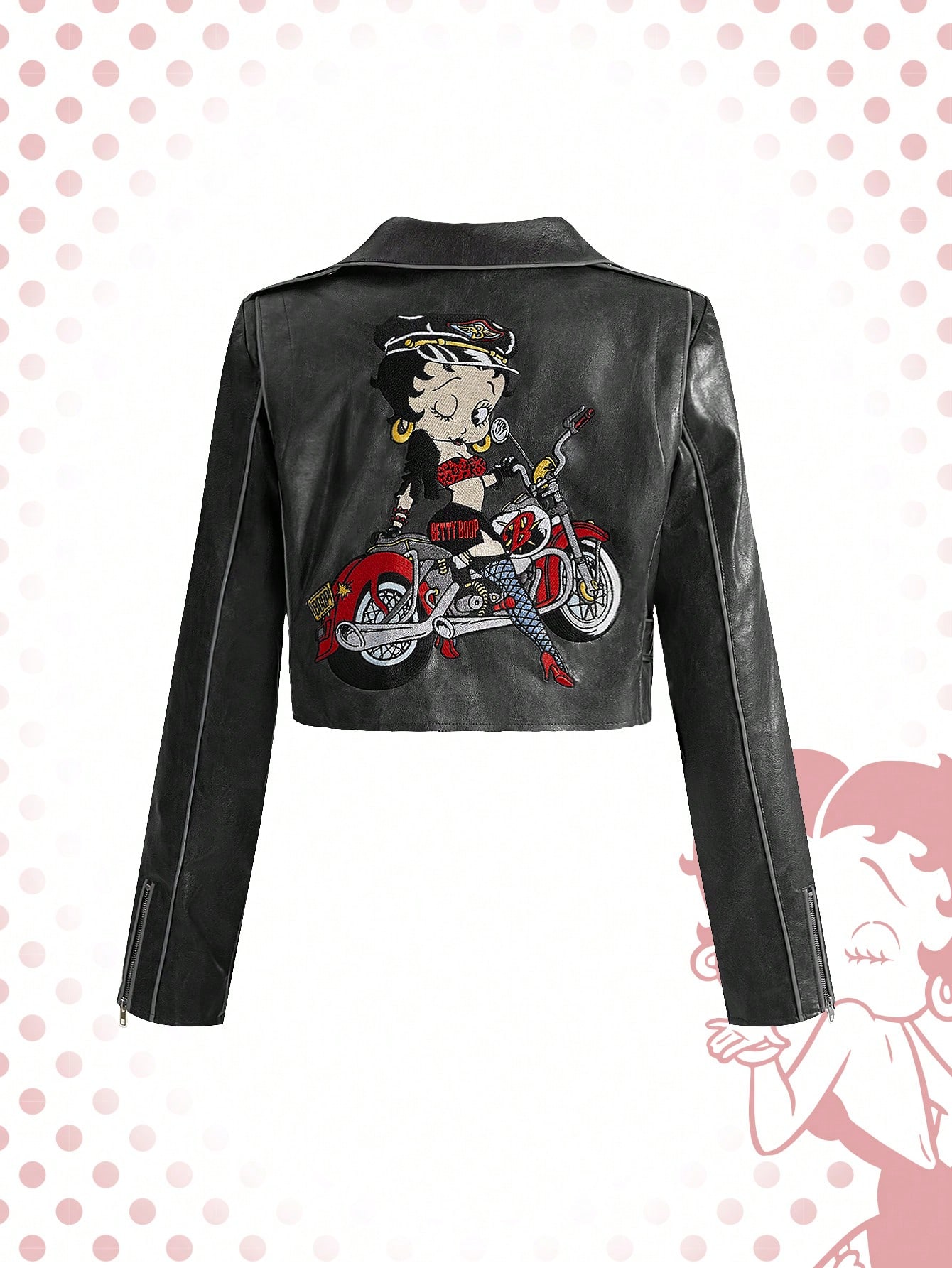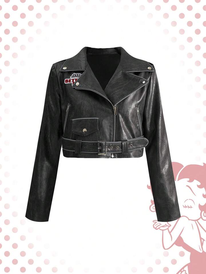 Betty Boop | ROMWE Chaqueta de cuero sintético con bordado y ribete de contraste estilo motero Y2K para mujer