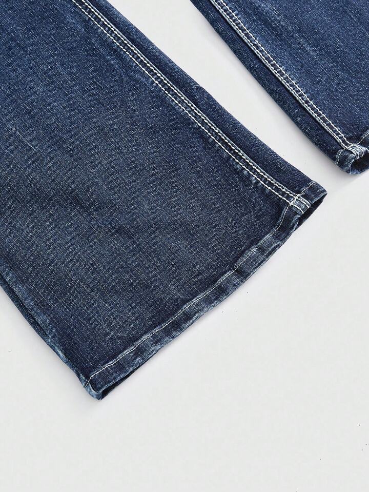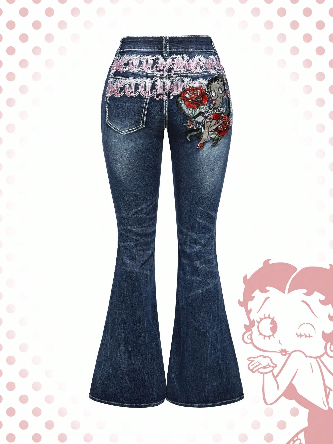 Betty Boop | ROMWE Jeans acampanados de tiro súper bajo con bordado de Betty en estilo retro desgastado Y2K para mujeres