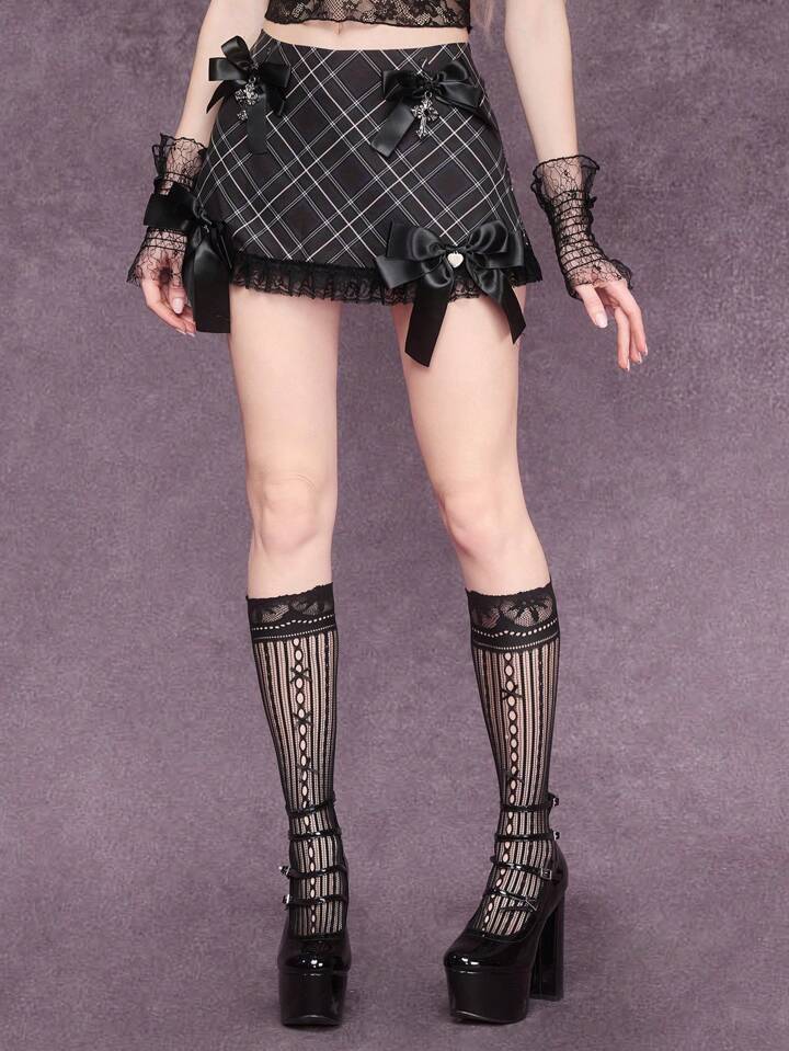 Goth Minifalda con estilo de escuela gótica, diseño de tartan negro y gris, con moño, para mujeres