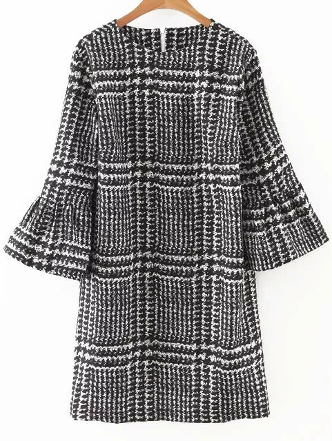 Vestido manga acampanada con estampado pata de gallo - negro