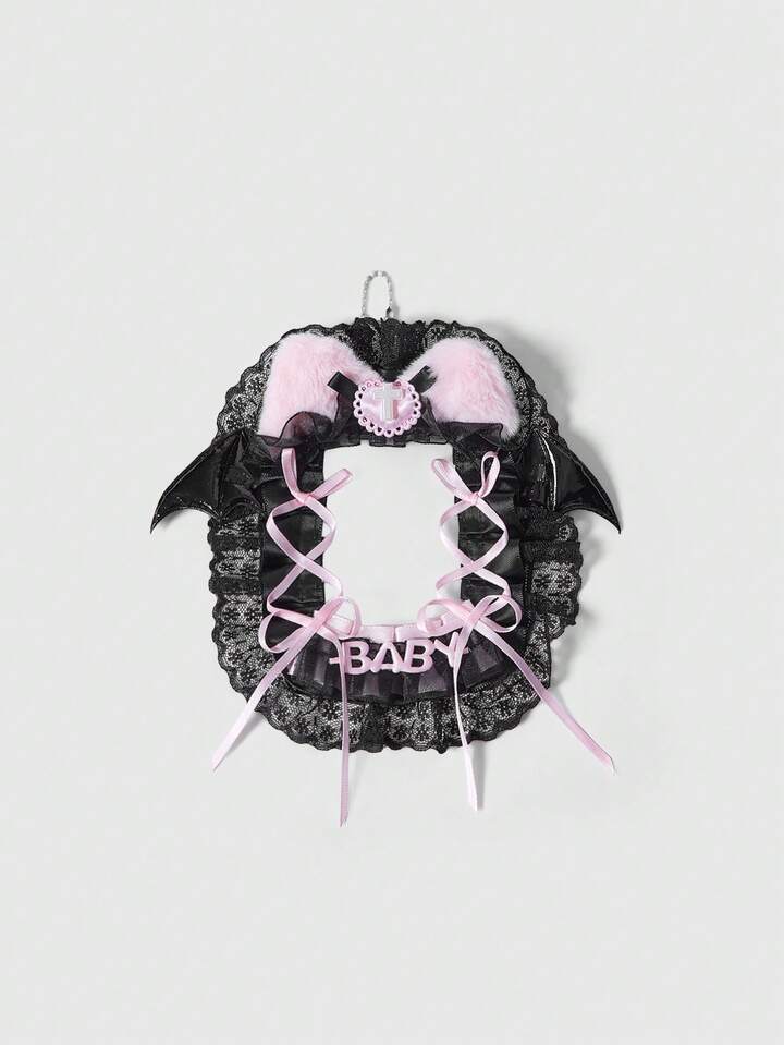 Anime Llavero con bolsillo para tarjetas, diseño de lazo de encaje negro, orejas de gato y contraste de color, accesorio de moda casual y multifuncional para tarjeta de identificación, fotos