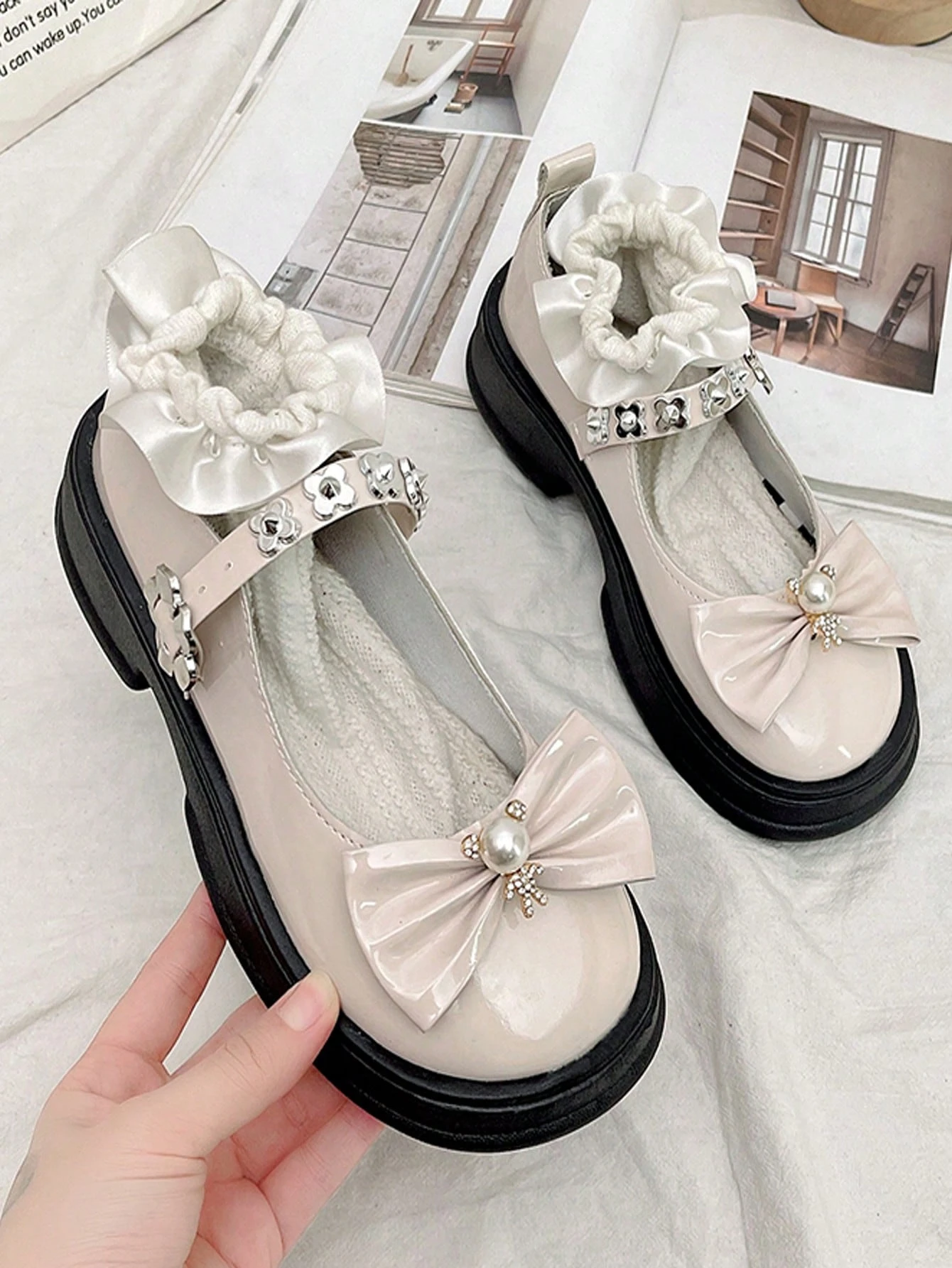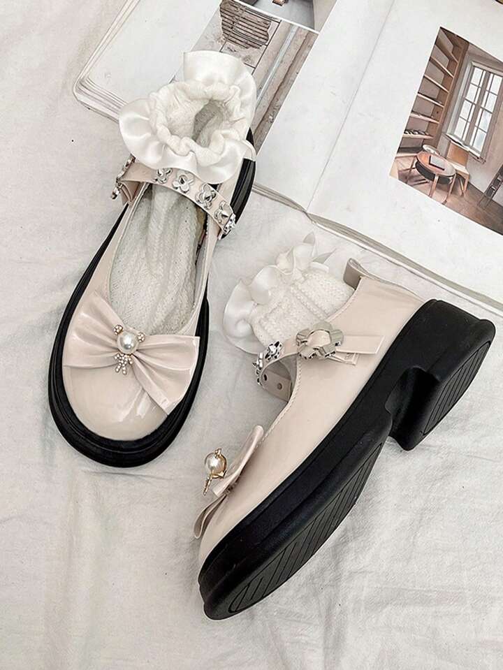 Zapatos Mary Jane Con Plataforma Plana Y Ribete De Volantes Y Decoración De Lazo
