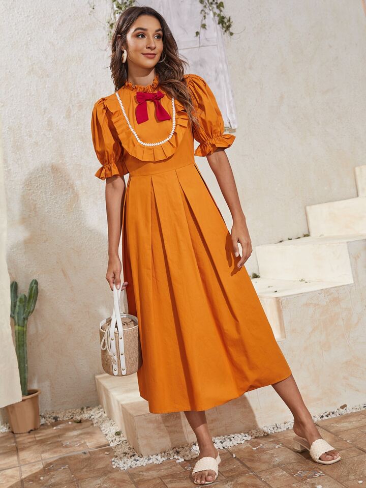 Vestido ribete con fruncido con lazo delantero