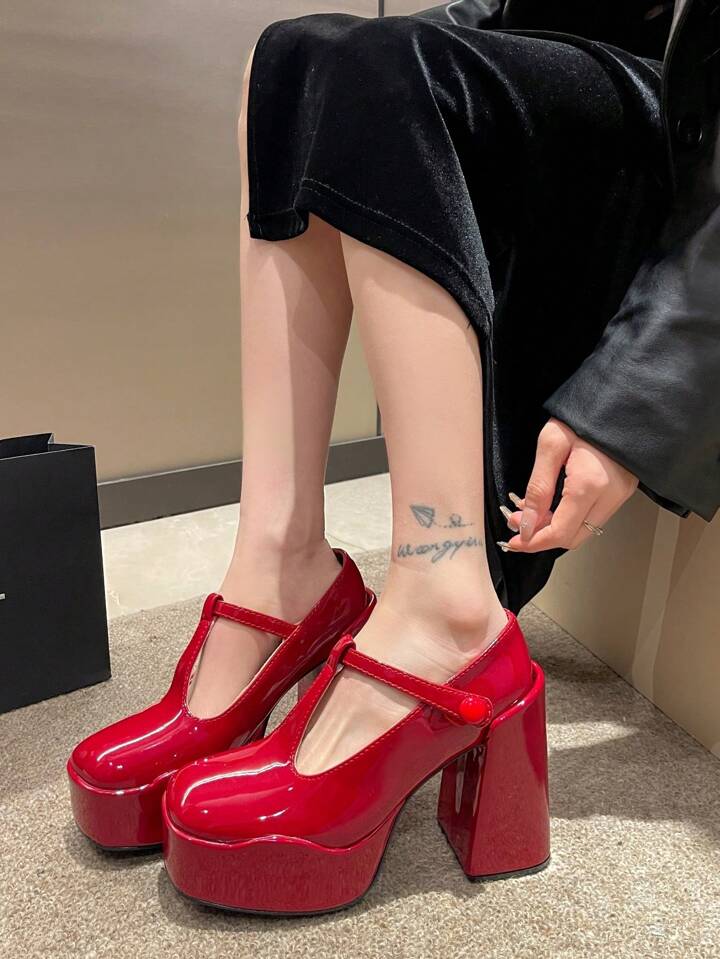 Tacones altos burdeos para mujer, bodas de verano, zapatos Mary Jane de tacón grueso