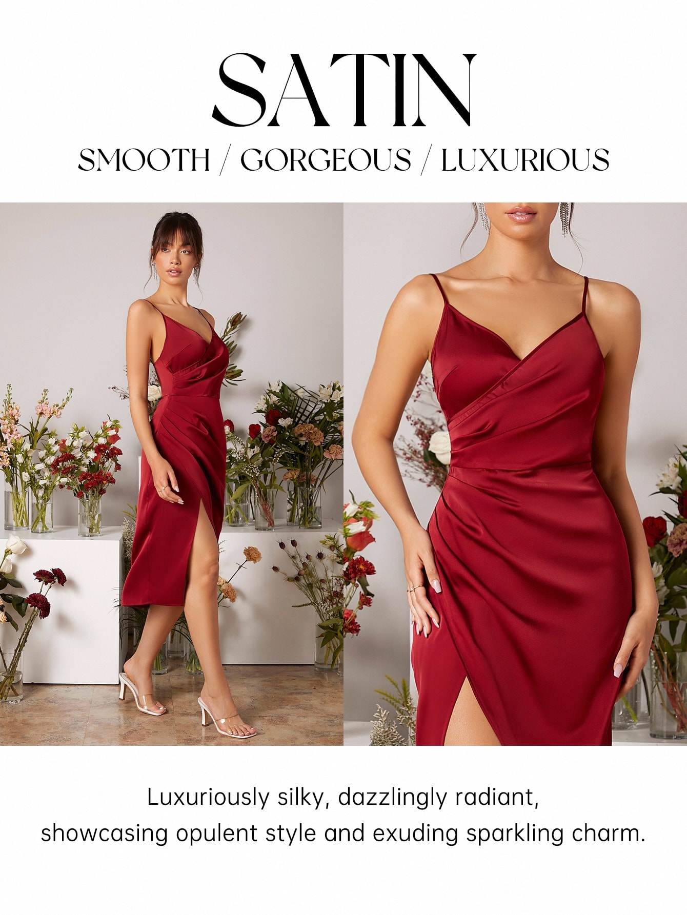 Vestido de dama de honor elegante color rojo burdeos con detalle de abertura y envolvente