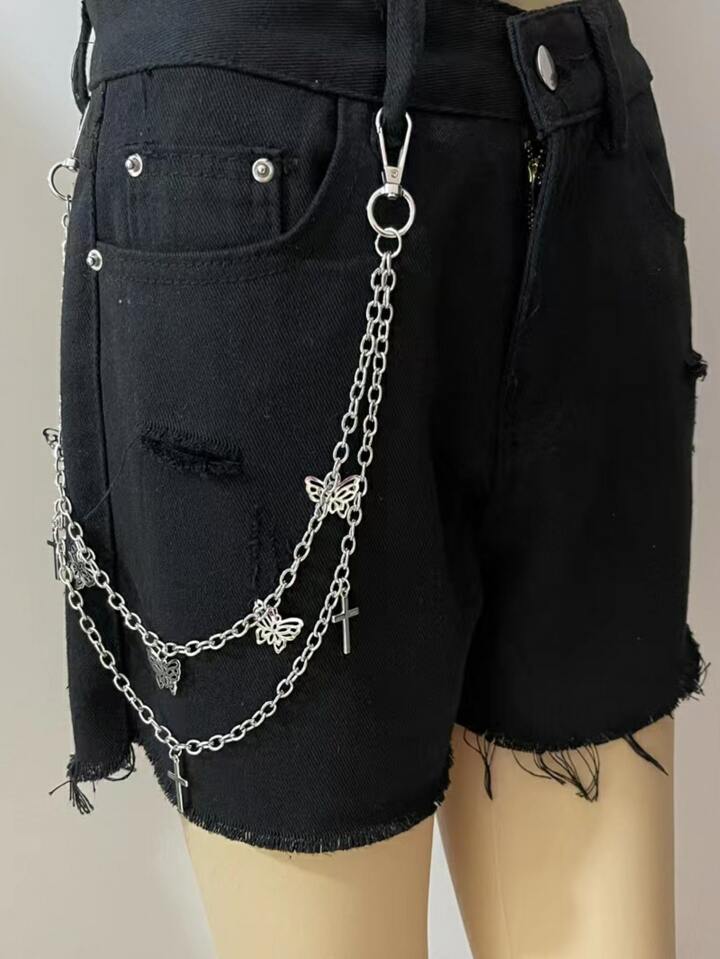 Cadena de pantalones con colgantes en capas de mariposa y cruz