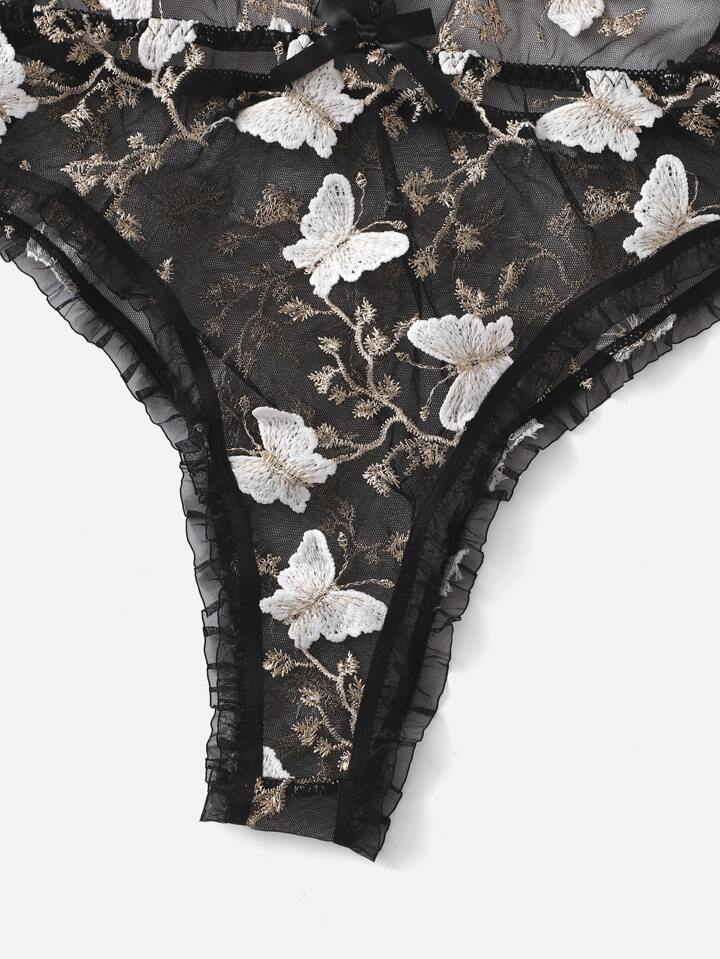 Body teddy con bordado de mariposa de malla de cuello profundo