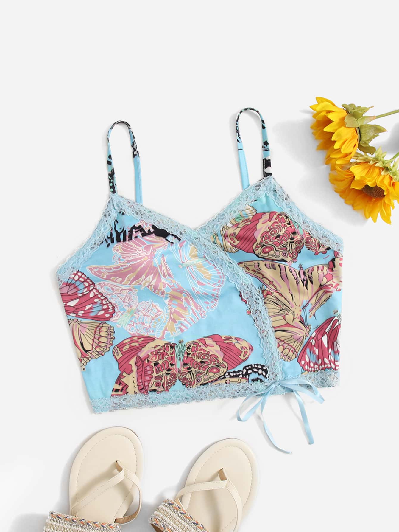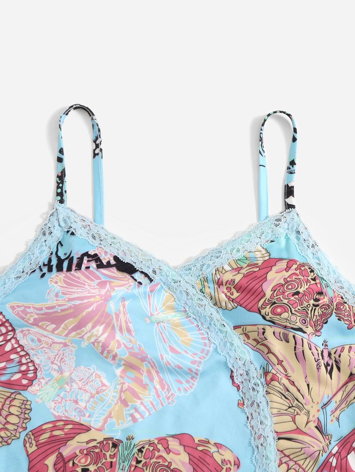 Top de tirantes con estampado de mariposa con encaje en contraste con lazo delantero