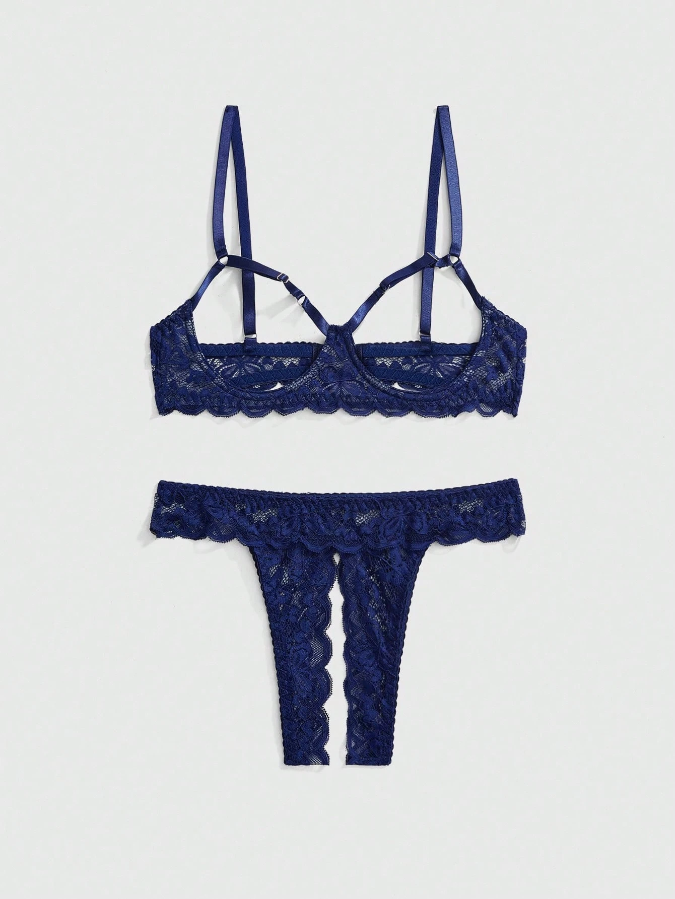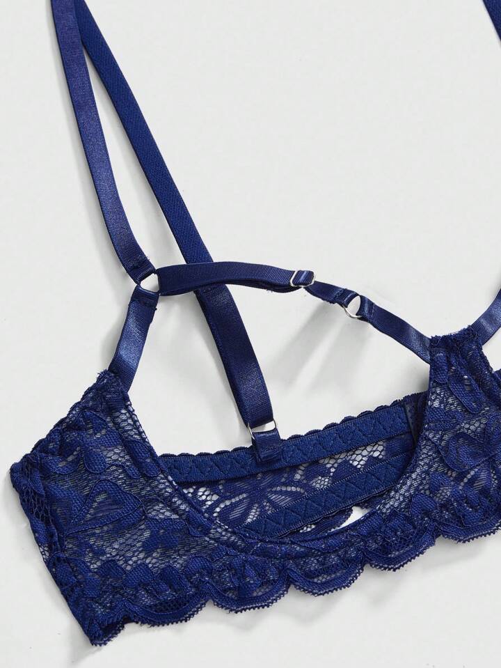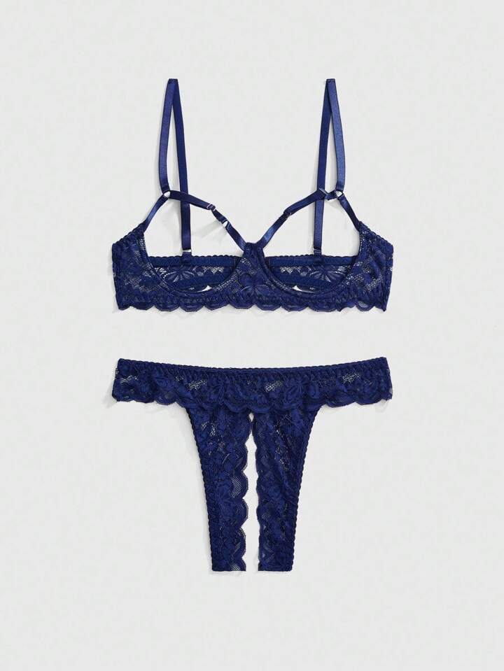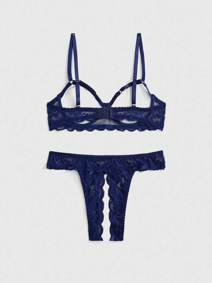 Conjunto de lencería sexy con sostén sin aros de encaje con motivo de mariposa y tanga de entrepierna abierta