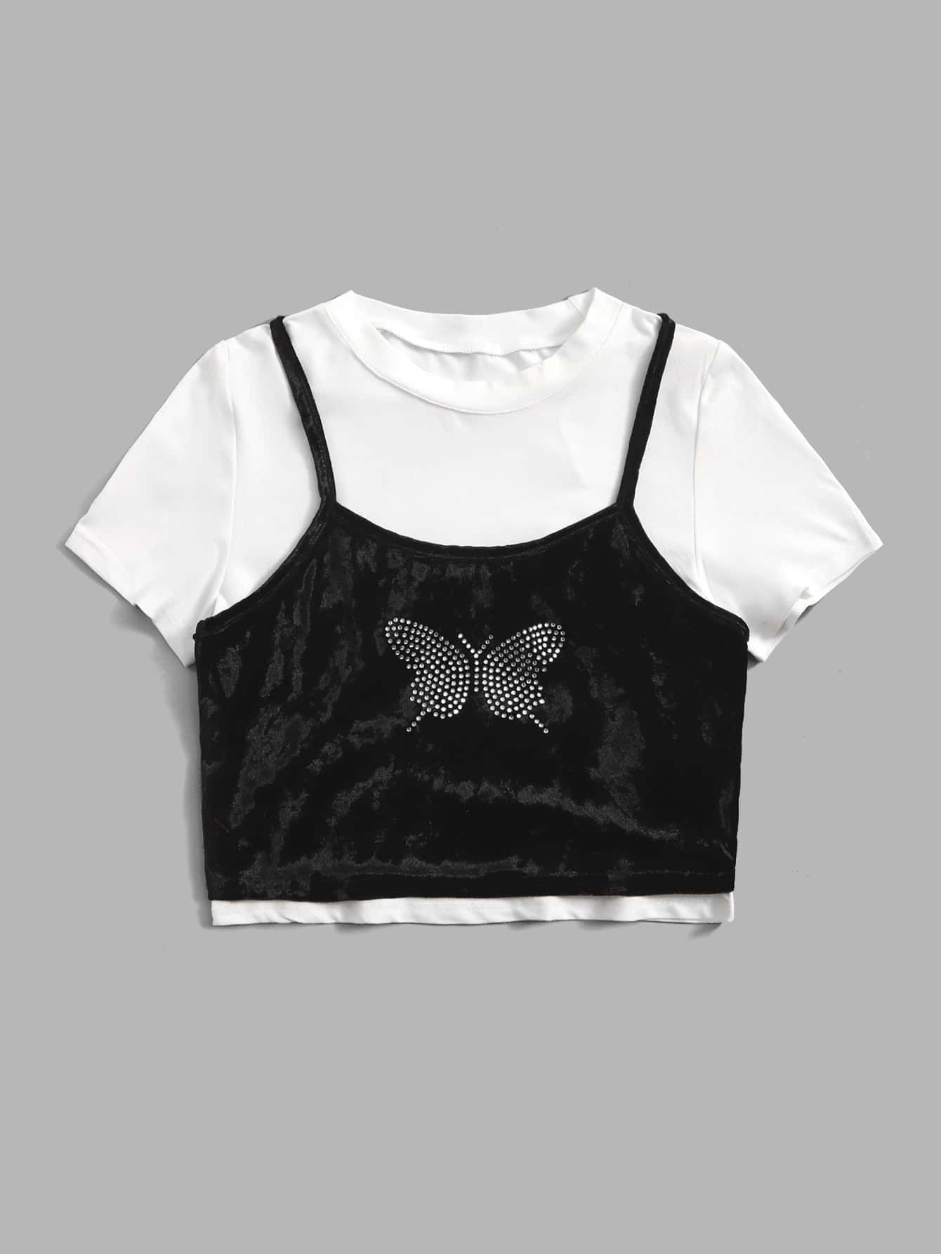 con mariposa con diamante de imitación Top de tirantes & Camiseta unicolor